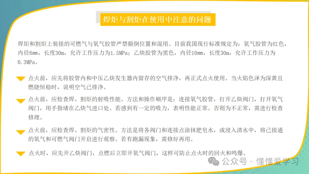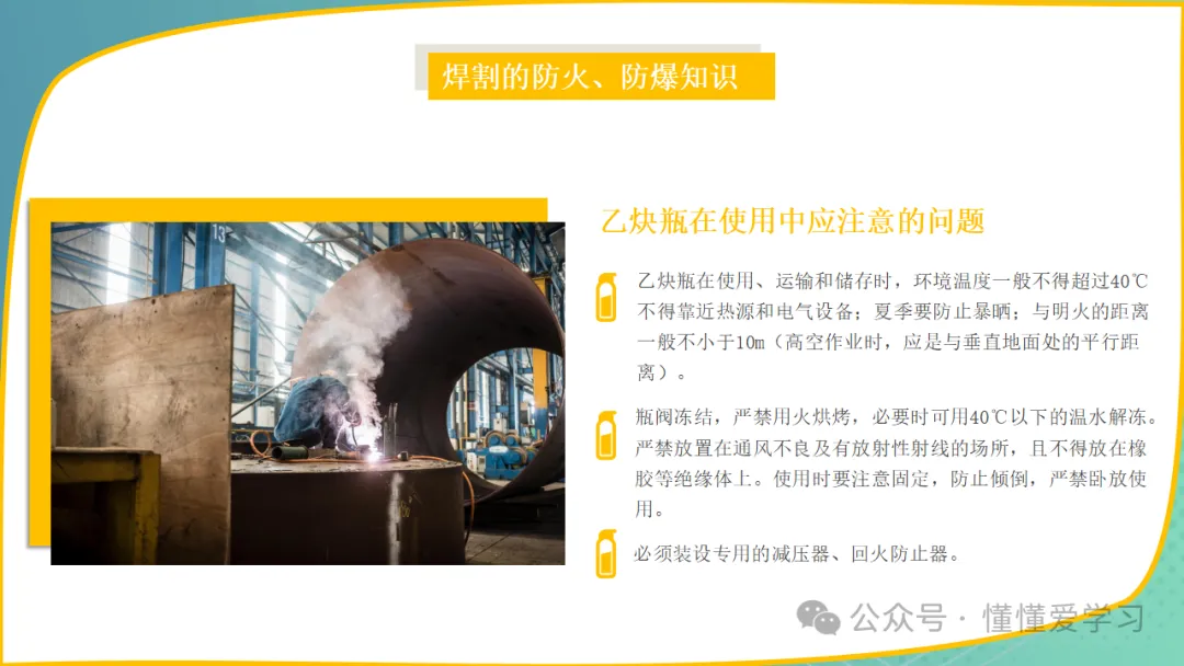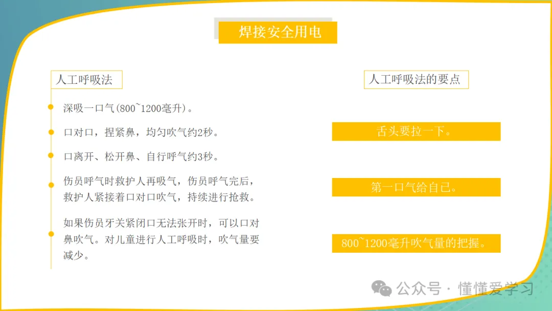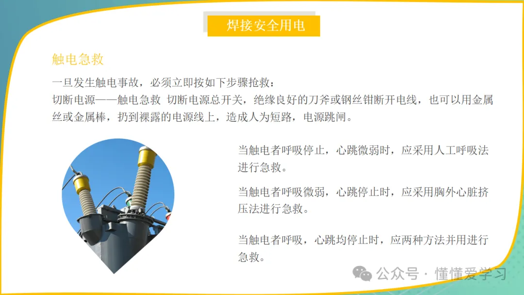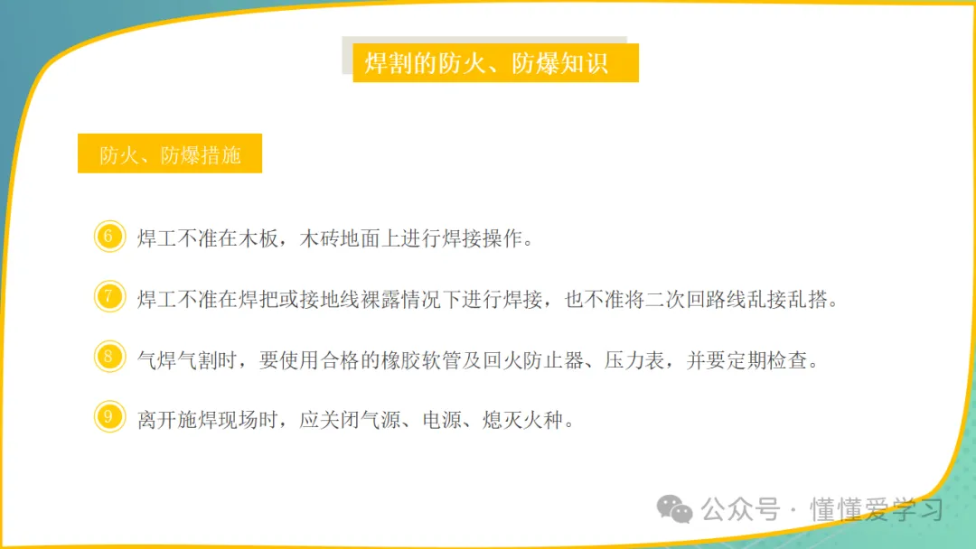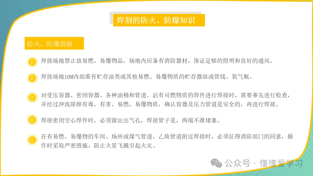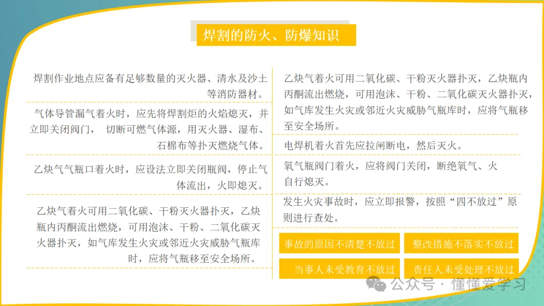 焊接操作人员应熟悉并掌握灭火技术,了解不同类型火灾的灭火方法。同时,应掌握触电急救及人工呼吸方法,一旦发生触电事故,能够迅速采取有效措施进行救援。