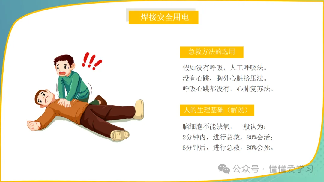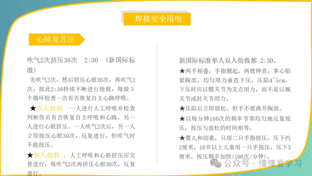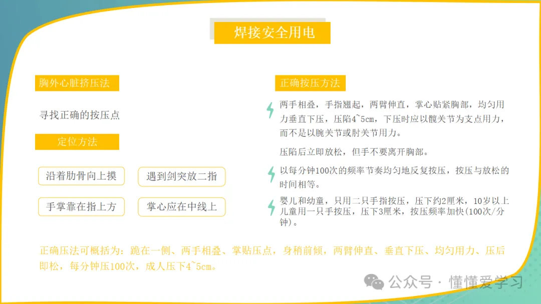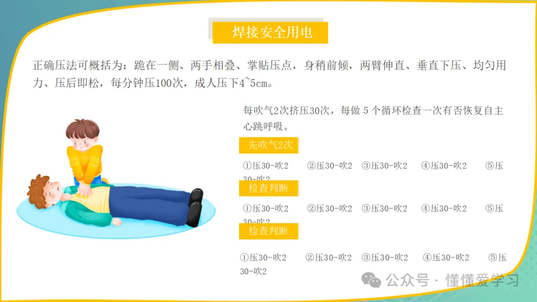 心肺复苏(CPR)是电焊作业中一旦发生触电事故时,挽救生命的关键技能。正确的CPR按压方法如下: