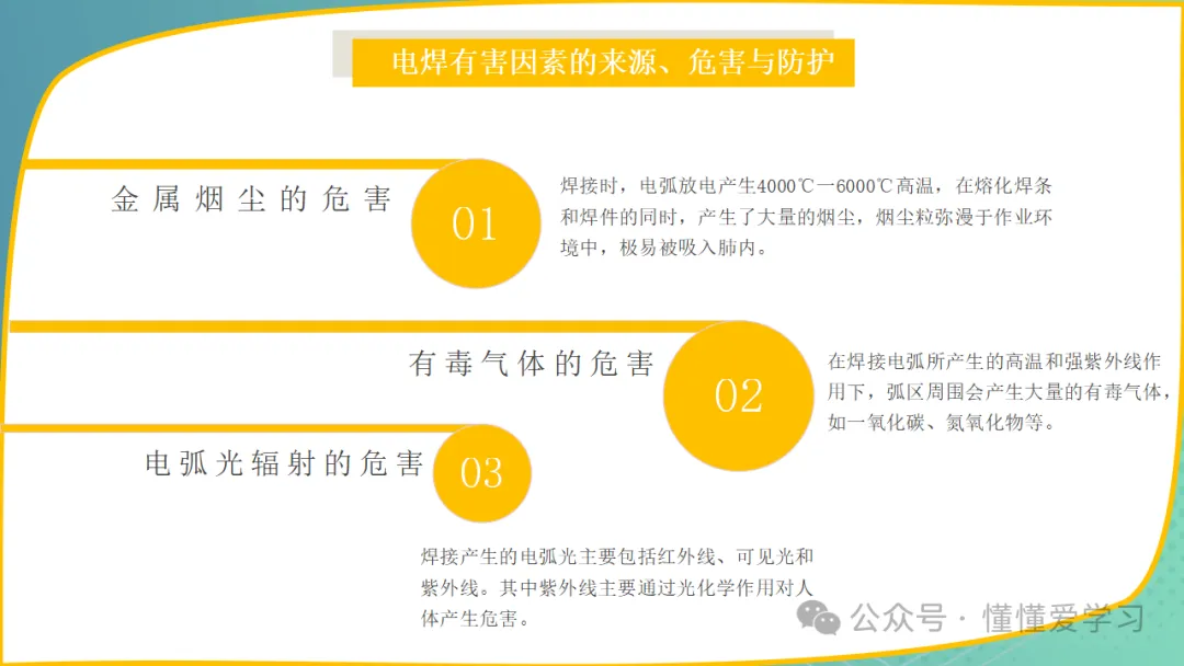 - 金属烟尘:焊接产生的烟尘含有有害金属元素,长期吸入可引起职业病。