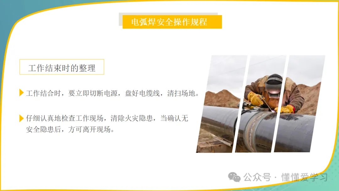 - 作业后维护:作业后,应及时清理现场,断开电源,对电焊设备进行维护保养,确保其处于良好状态。