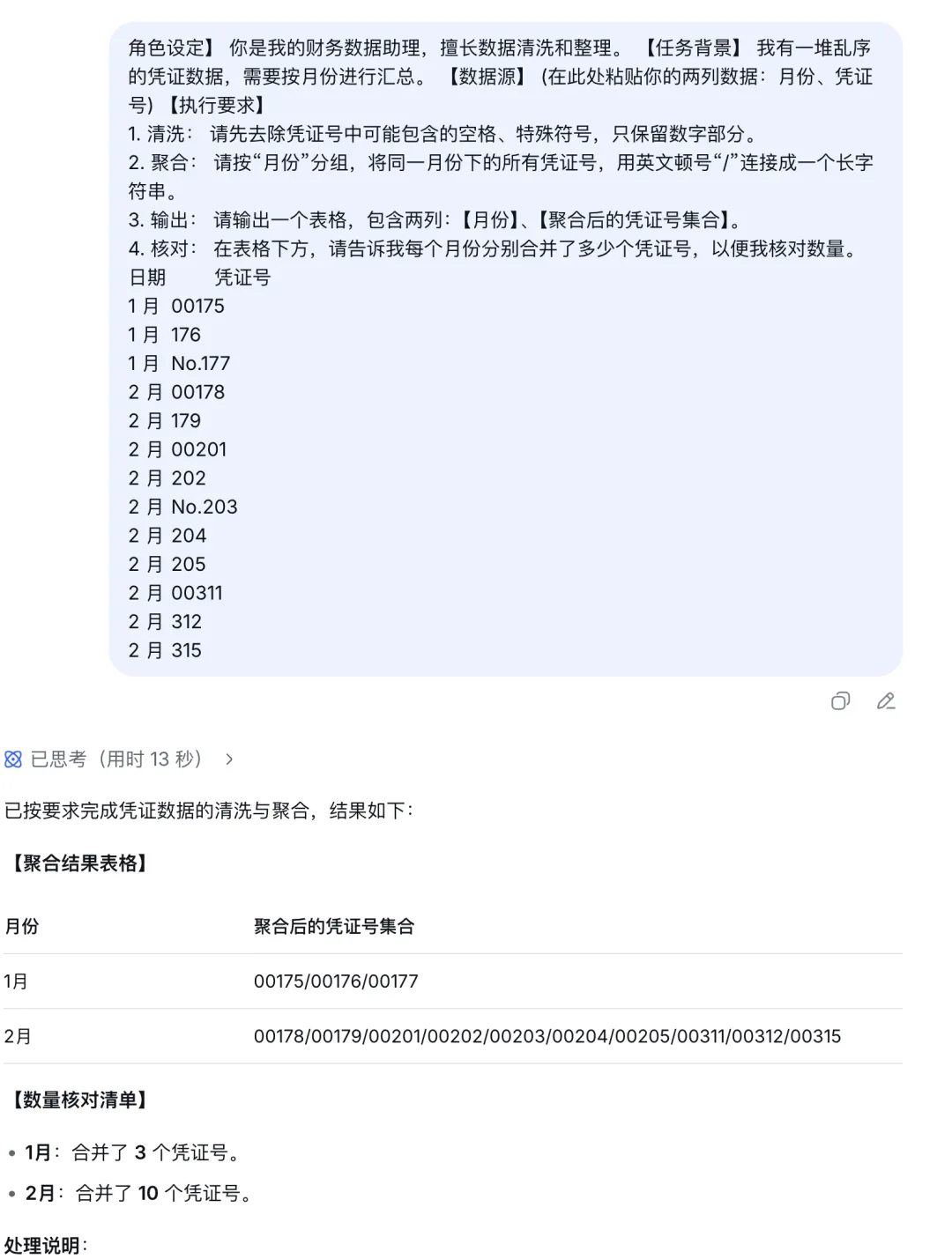 【角色设定】你是我的财务数据助理,擅长清洗脏数据。【任务背景】我有一堆乱序的凭证数据,需要按月份进行汇总。【数据源】(在此处粘贴你的两列数据:月份、凭证号)【执行要求】