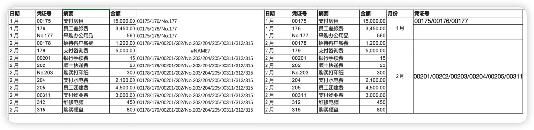 聚合:按“月份”分组,将同一月份下的所有凭证号,用英文顿号“/”连接成一个长字符串。