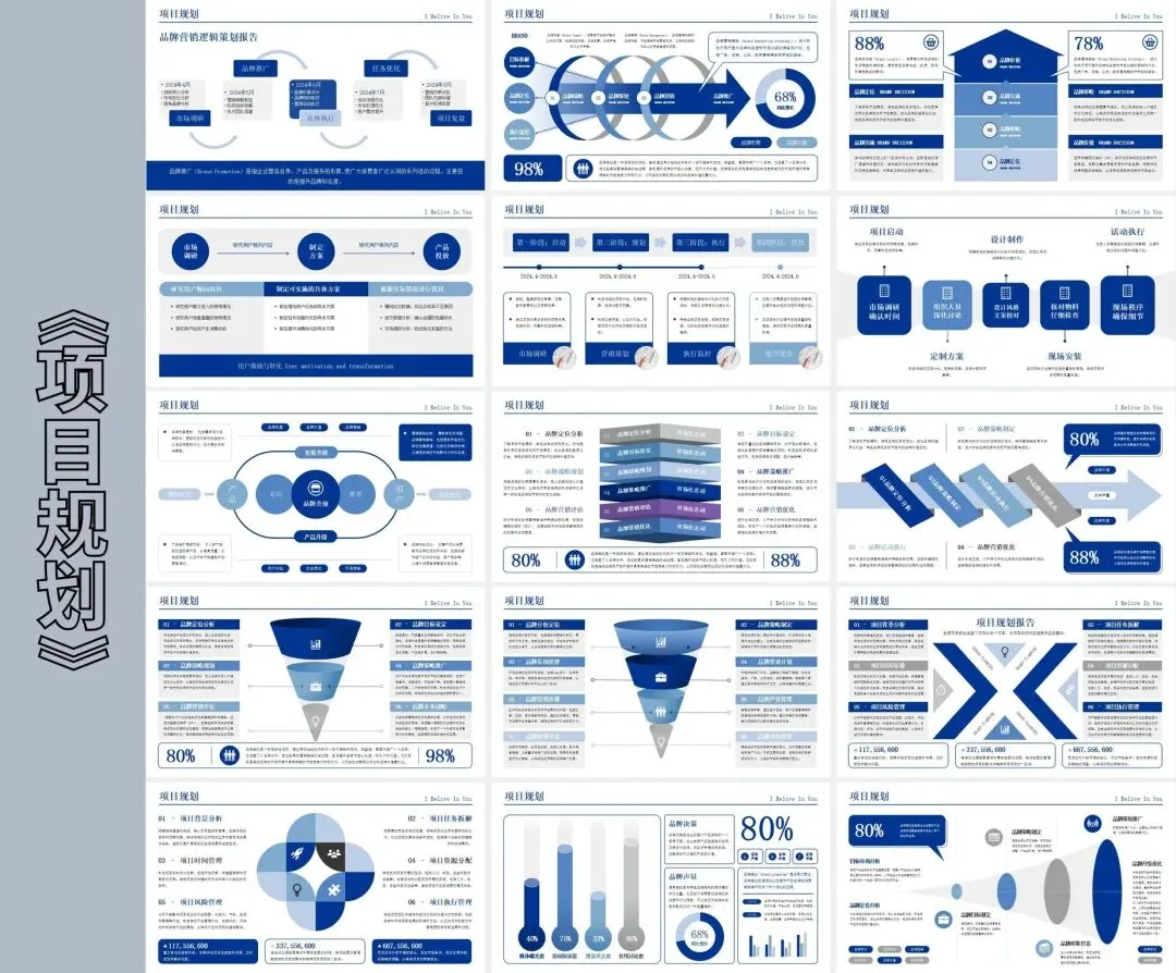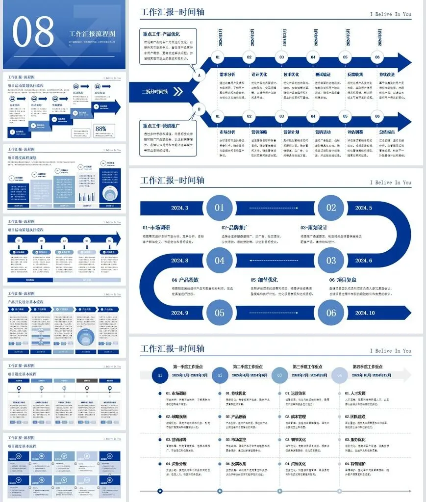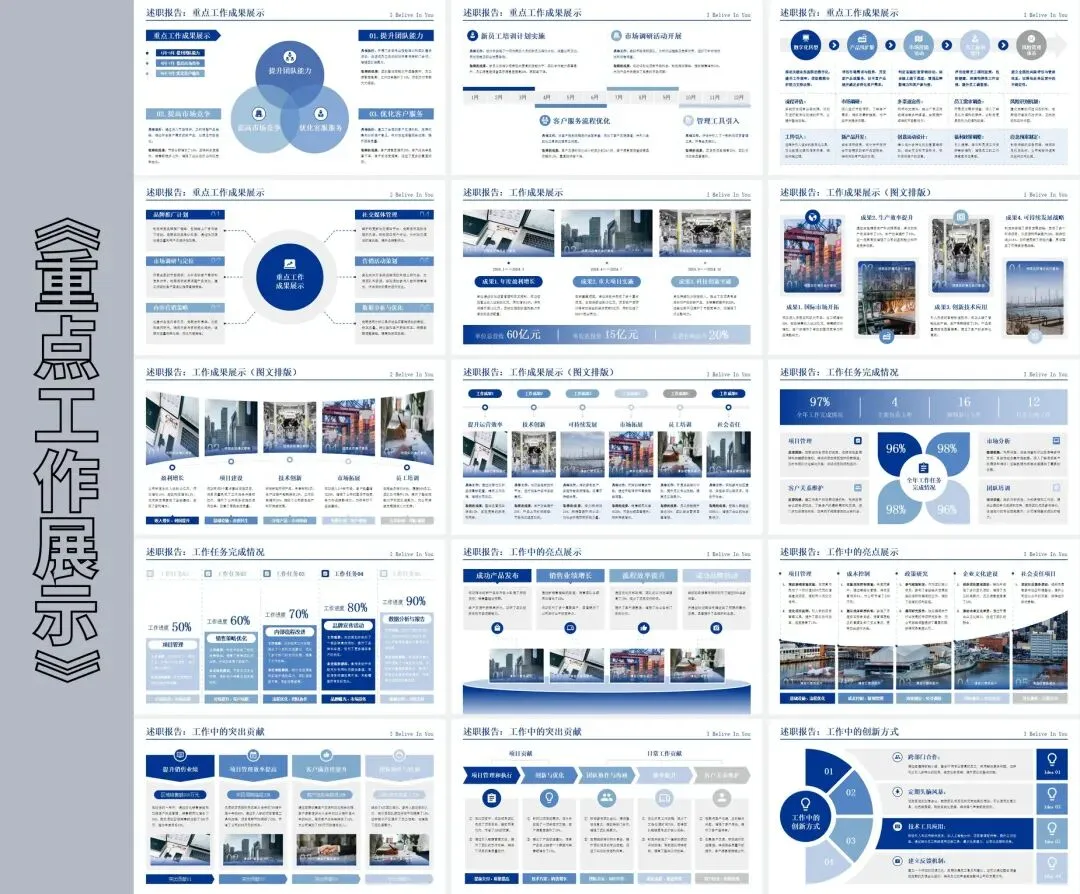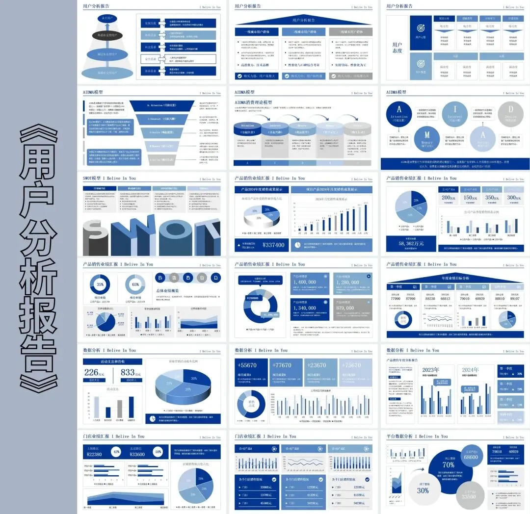 整套模板采用蓝色为主色调,搭配白色和浅灰色辅助色,营造出沉稳大气的商务氛围。页面布局遵循信息层级原则,标题、正文、图表区域划分清晰,便于观众快速抓取重点。