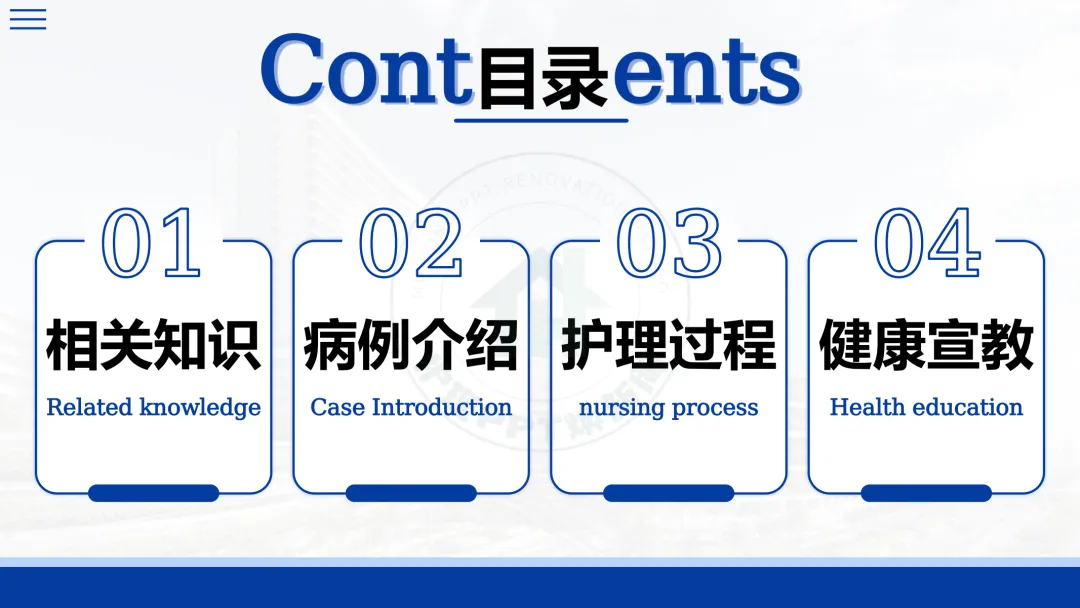 本次查房将围绕四个部分展开:疾病相关知识、病例介绍、护理过程及健康宣教。