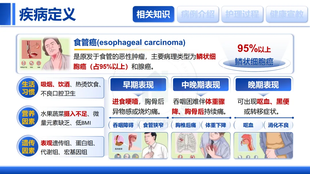 食管癌是常见的消化道恶性肿瘤,早期诊断与系统护理对预后至关重要。