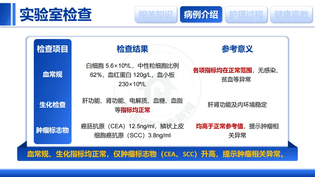 血常规、生化基本正常,但肿瘤标志物CEA、SCC升高,提示肿瘤存在。