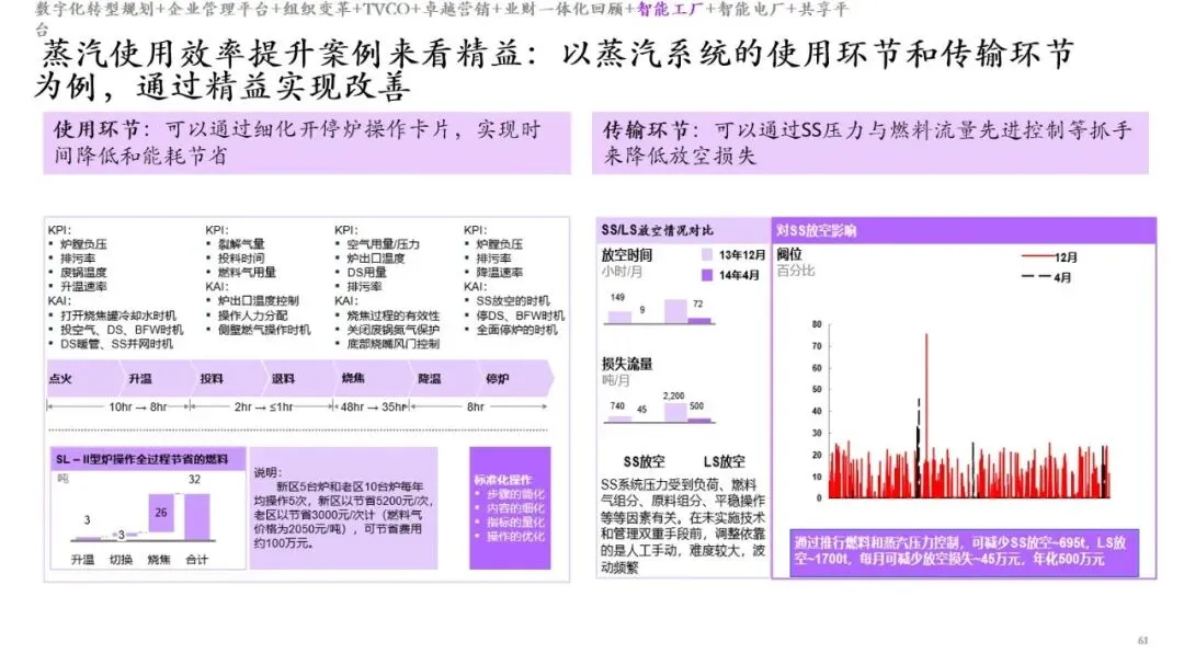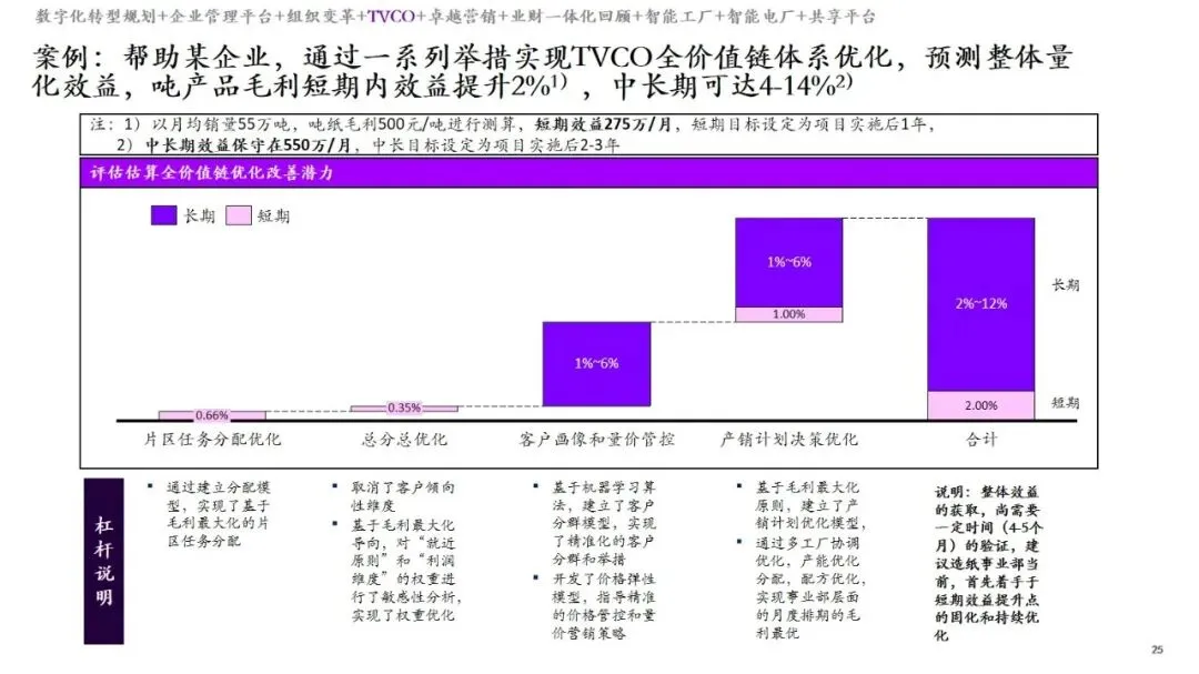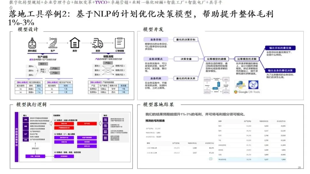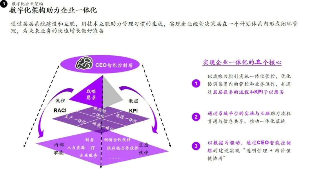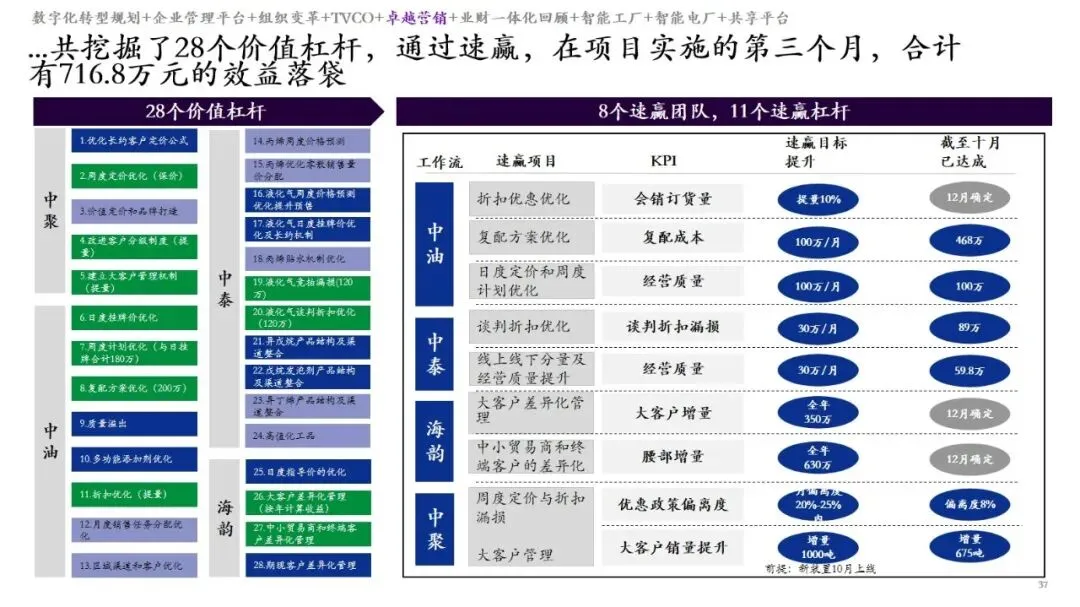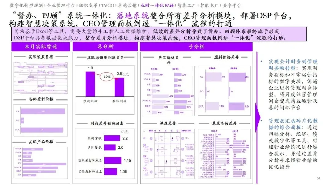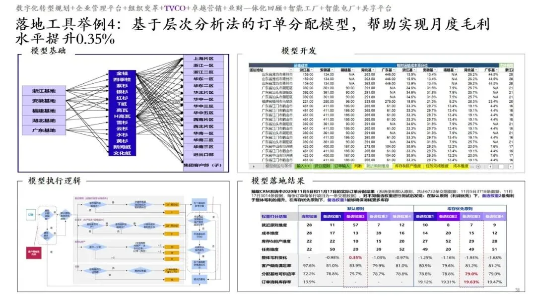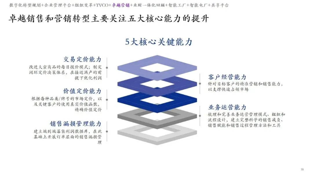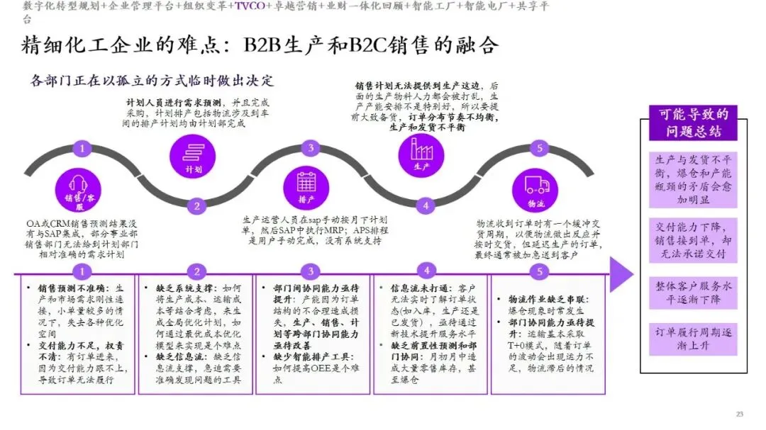在运营层面上,围绕整个价值链的优化,打通“产、供、研”的前后端。运用需求预测模型,优化产销计划,智能排产系统,提高企业整体效益:山鹰国际的电子采购和电子销售,使企业的总利润率提高了2%以上;京博石油销售公司试点模块年落袋利润2200多万元。同时,建立卓越的销售系统,以客户细分、弹性定价模型为基础,使市场需求精确匹配。