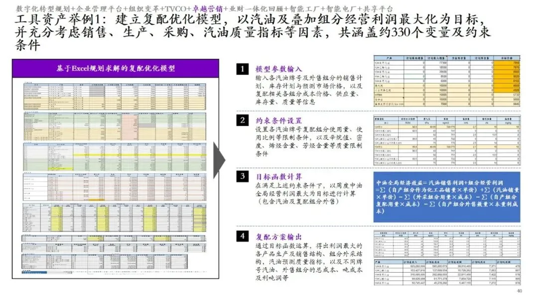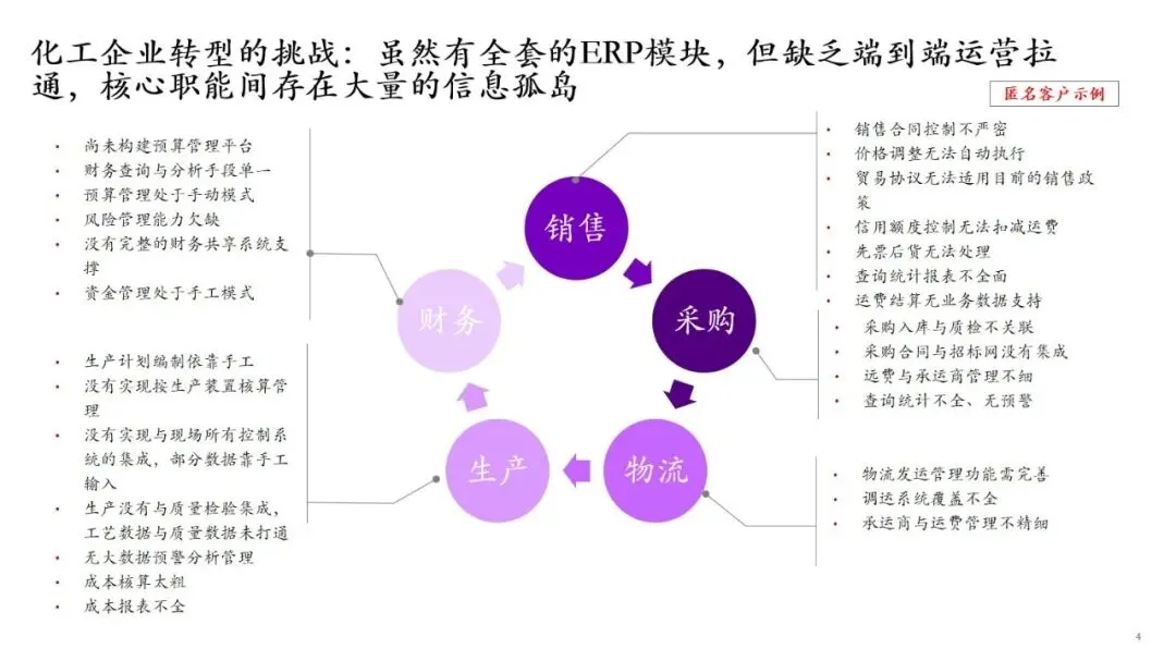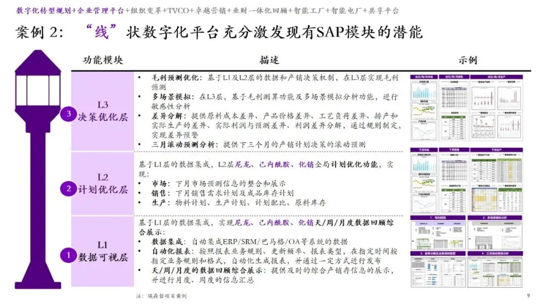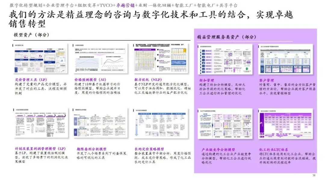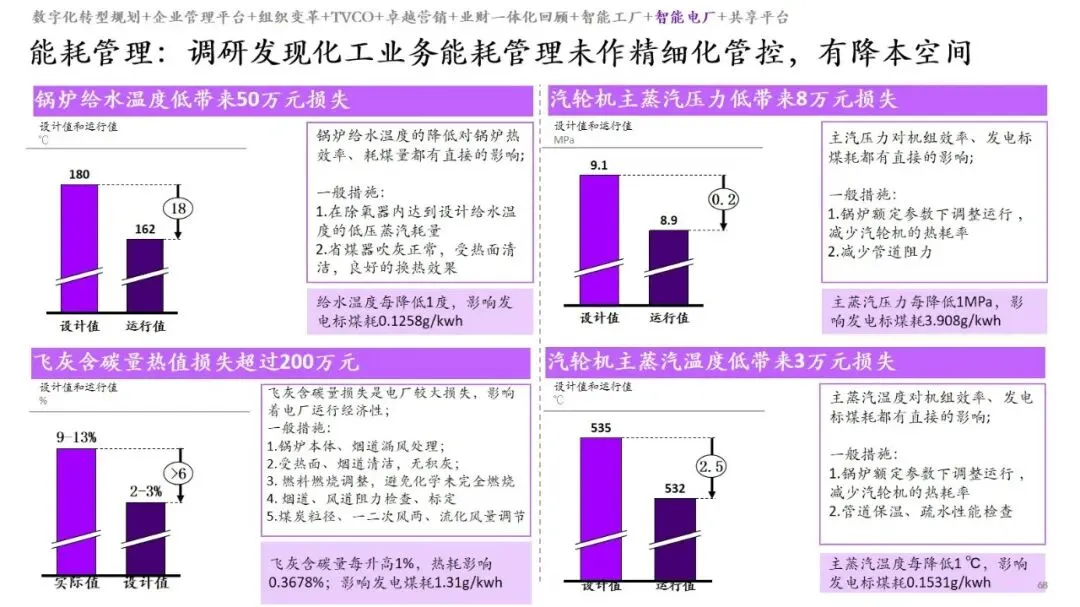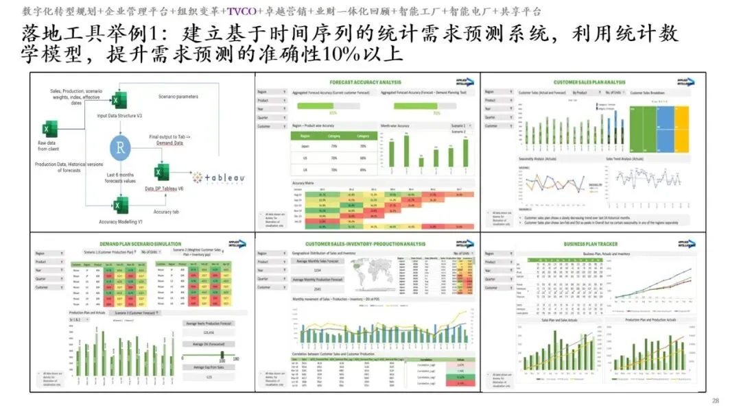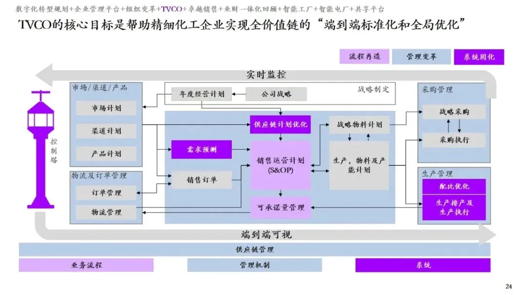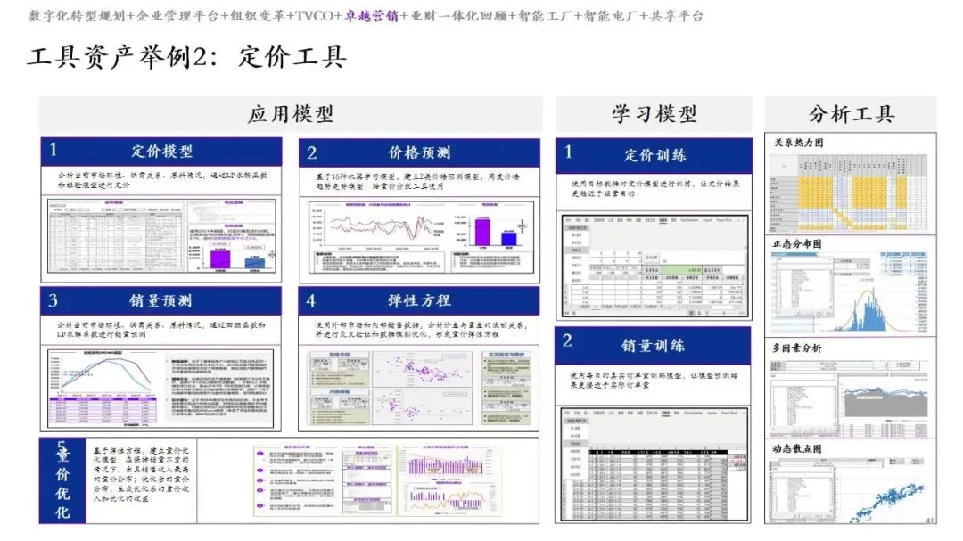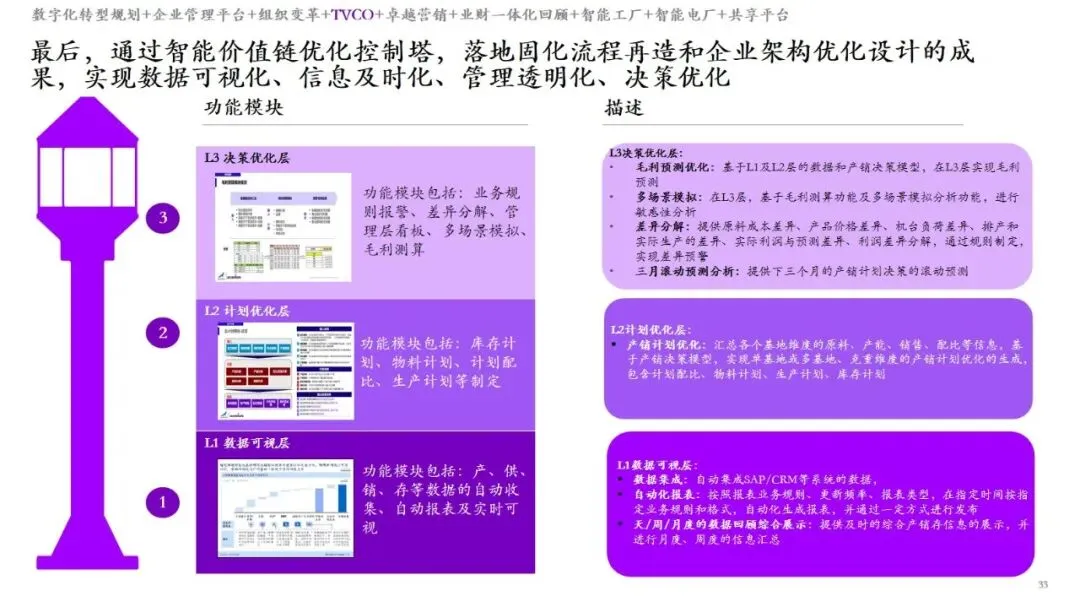 在运营层面上,围绕整个价值链的优化,打通“产、供、研”的前后端。运用需求预测模型,优化产销计划,智能排产系统,提高企业整体效益:山鹰国际的电子采购和电子销售,使企业的总利润率提高了2%以上;京博石油销售公司试点模块年落袋利润2200多万元。同时,建立卓越的销售系统,以客户细分、弹性定价模型为基础,使市场需求精确匹配。
