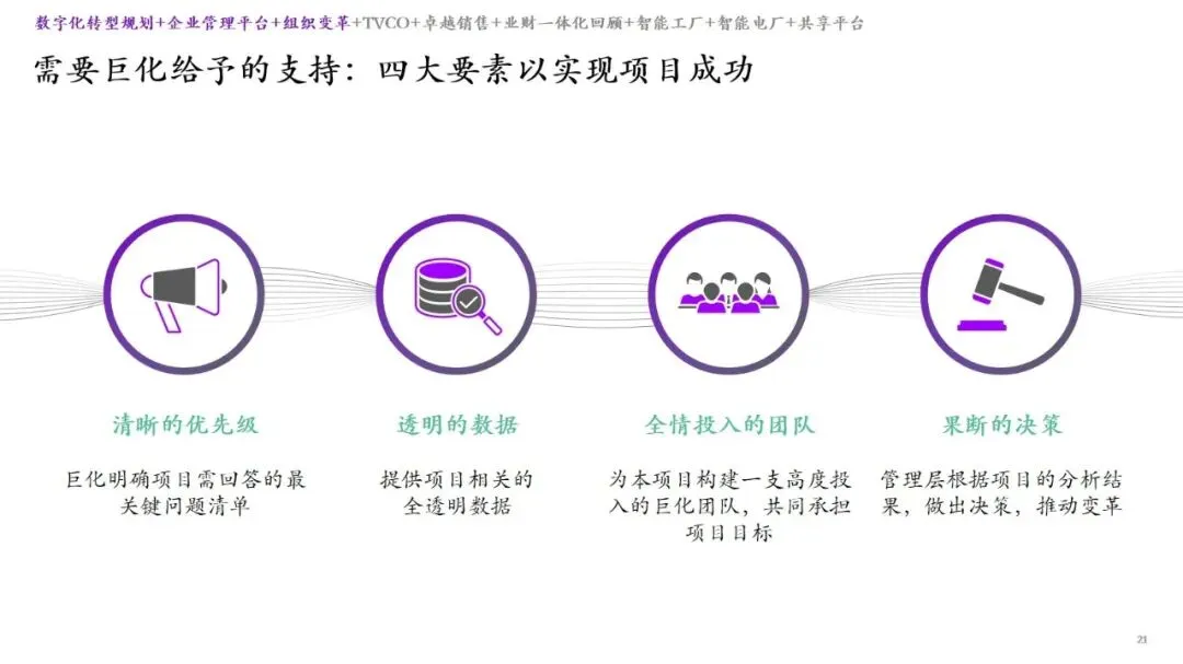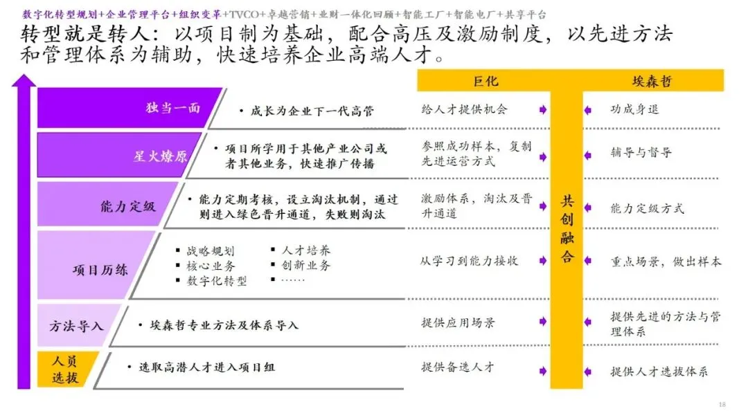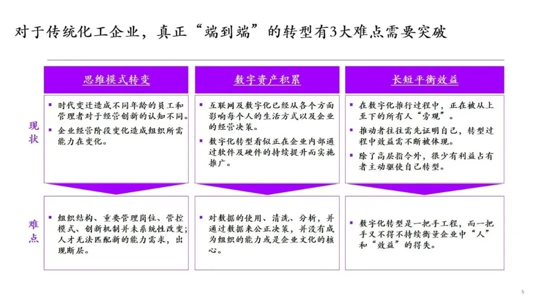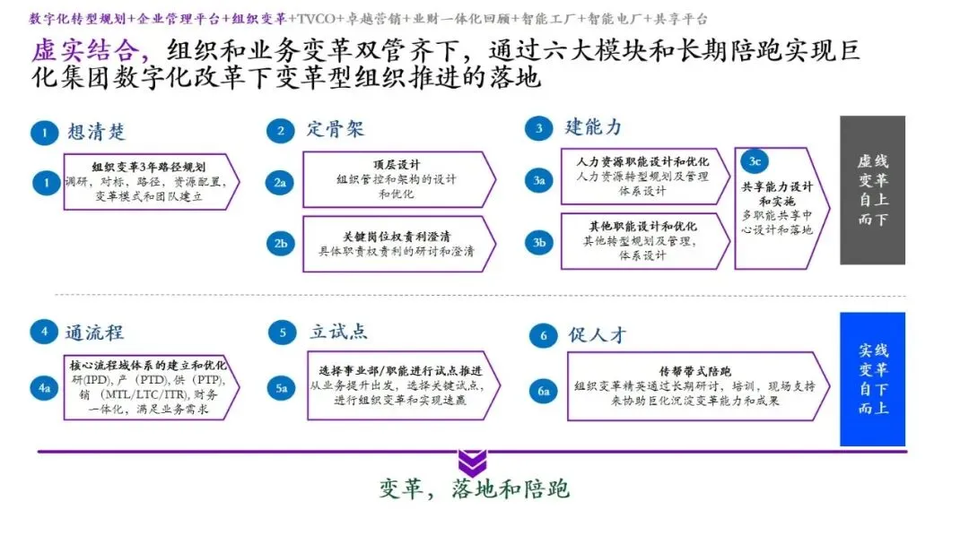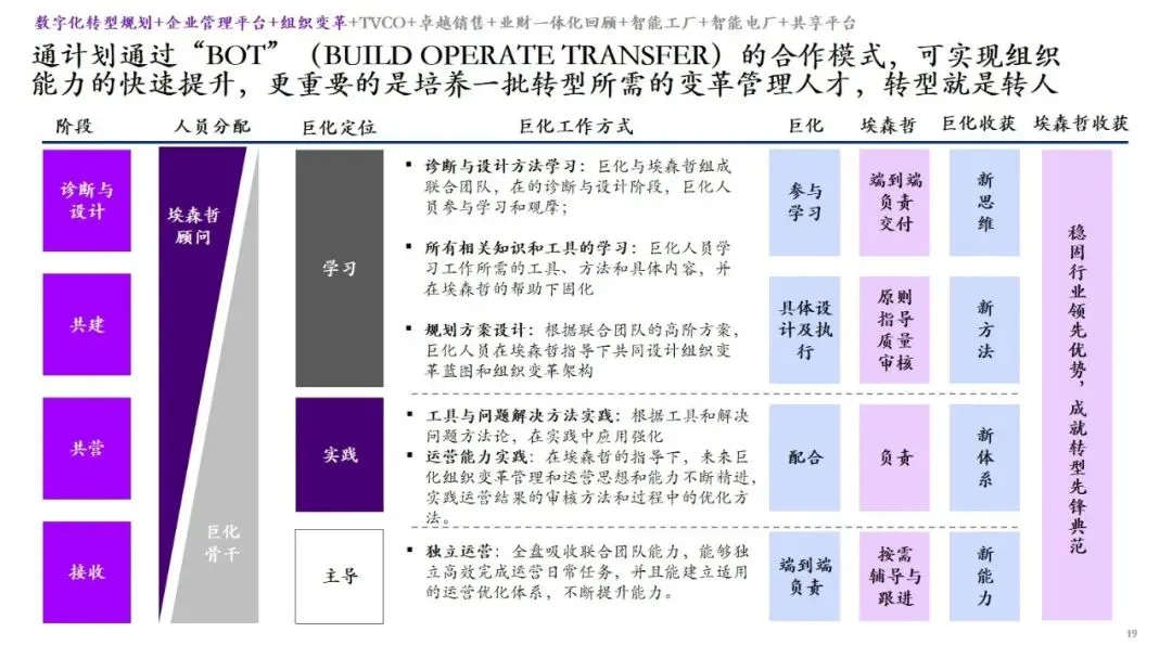 在转型中,组织变革和人才培养同步推进,以“传帮带”方式沉淀内在能力,以 BOT方式固化转型成果。从扬子石化的5个月精益改造带来2个亿的收益,再到旭阳的垂直电子商务模式的建立,这一系列的案例都证明了数字变革需要将技术工具和业务实践进行深度的融合,这样才能不断地释放变革的价值。