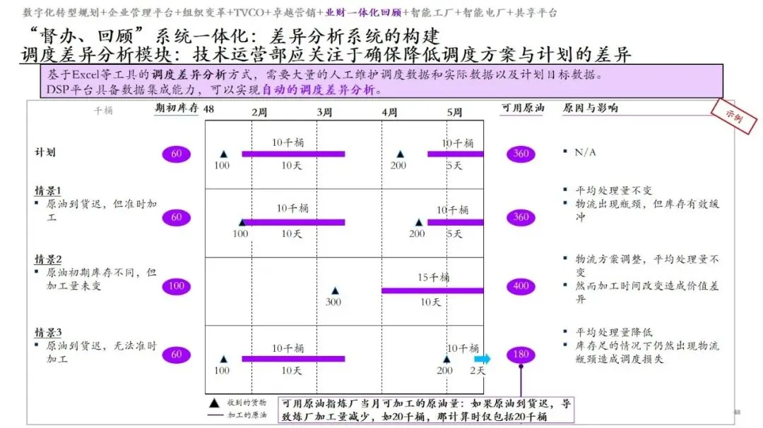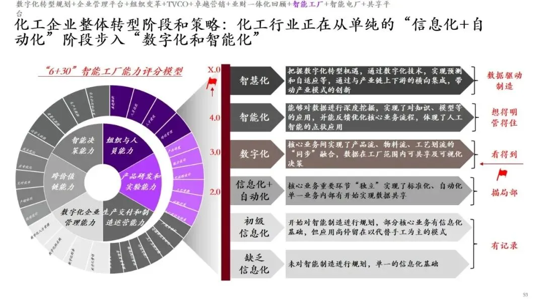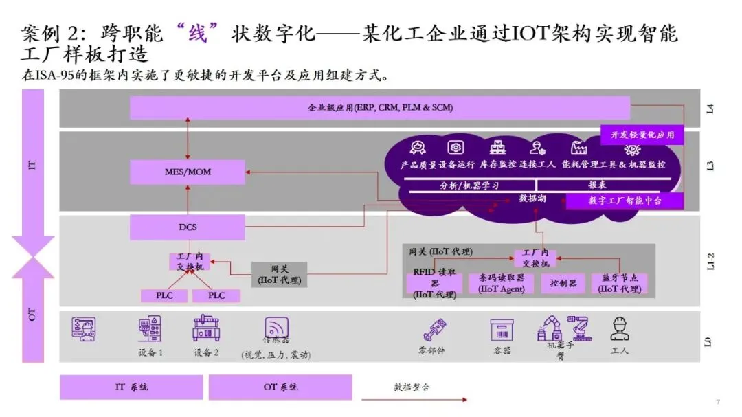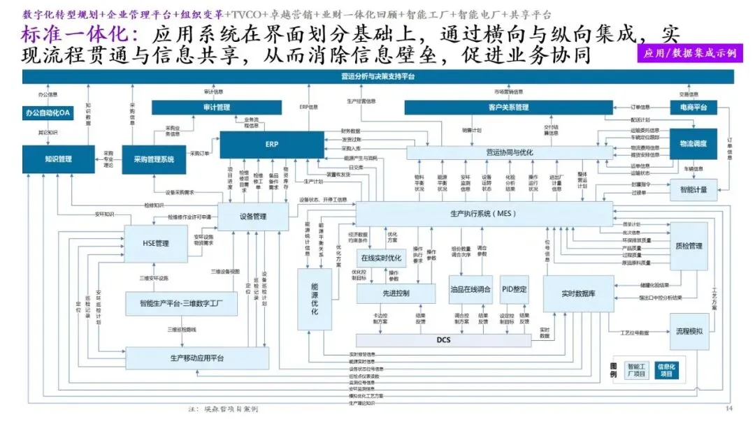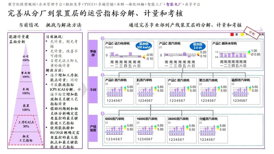 运营层以智能工厂和共享平台为基础,以ISA-95为框架构建物联网体系结构,将传感器、可编程序控制器、集散控制系统等集成在一起,实现对生产过程、质量和能耗数据的实时监测和控制。海科公司经过五年的智能规划,实现了100%的关键业务覆盖、0.5%的轻油收率和30%的电商平台配送效率提升。在单个方案(例如,通过锅炉氧气水平的优化来减少能量消耗)上进行初步的尝试,然后在跨职能的过程中推进拉通,并且最终在顶层规划和组织和技术之间进行完全的集成。
