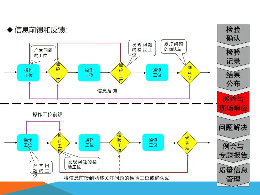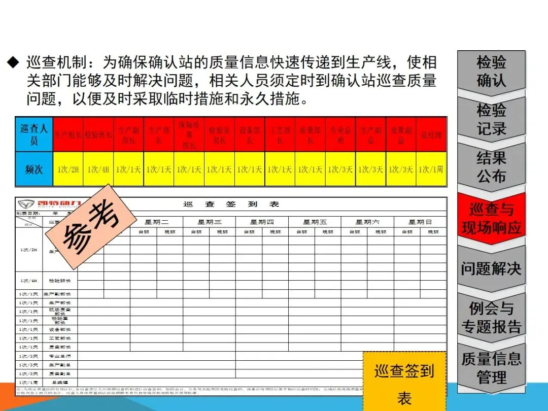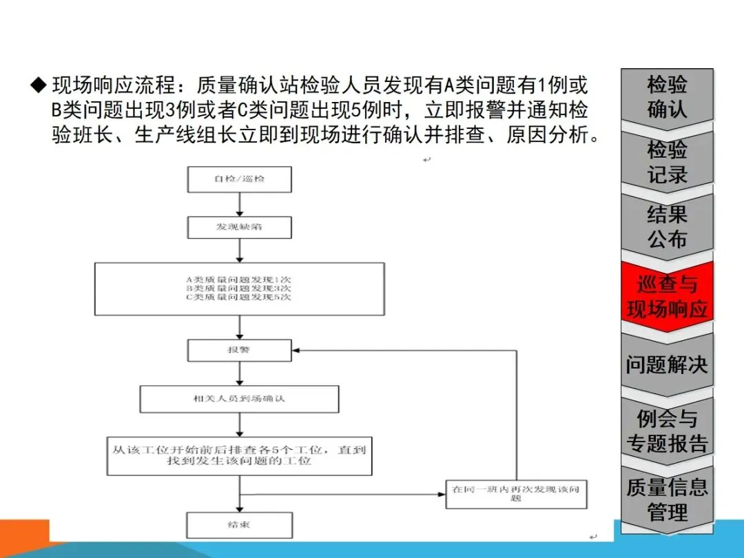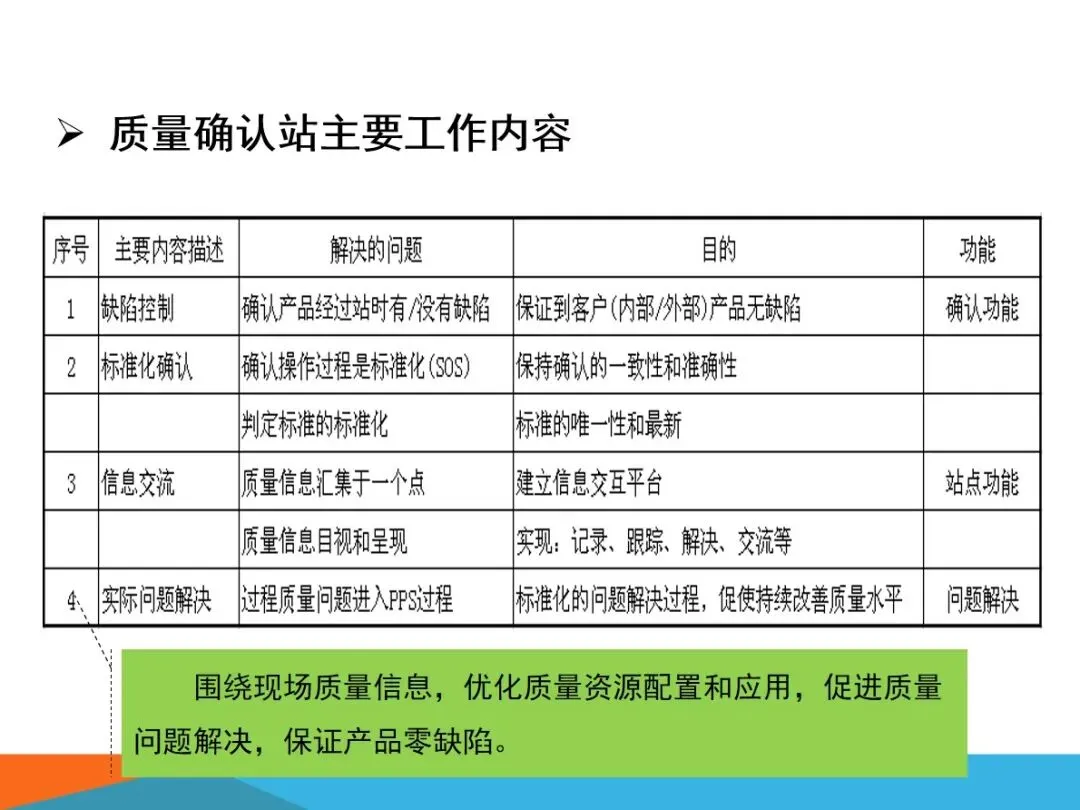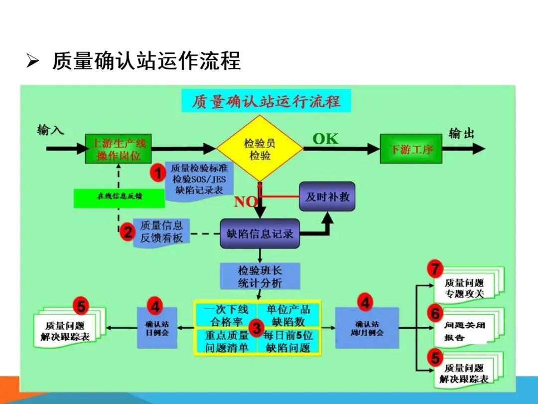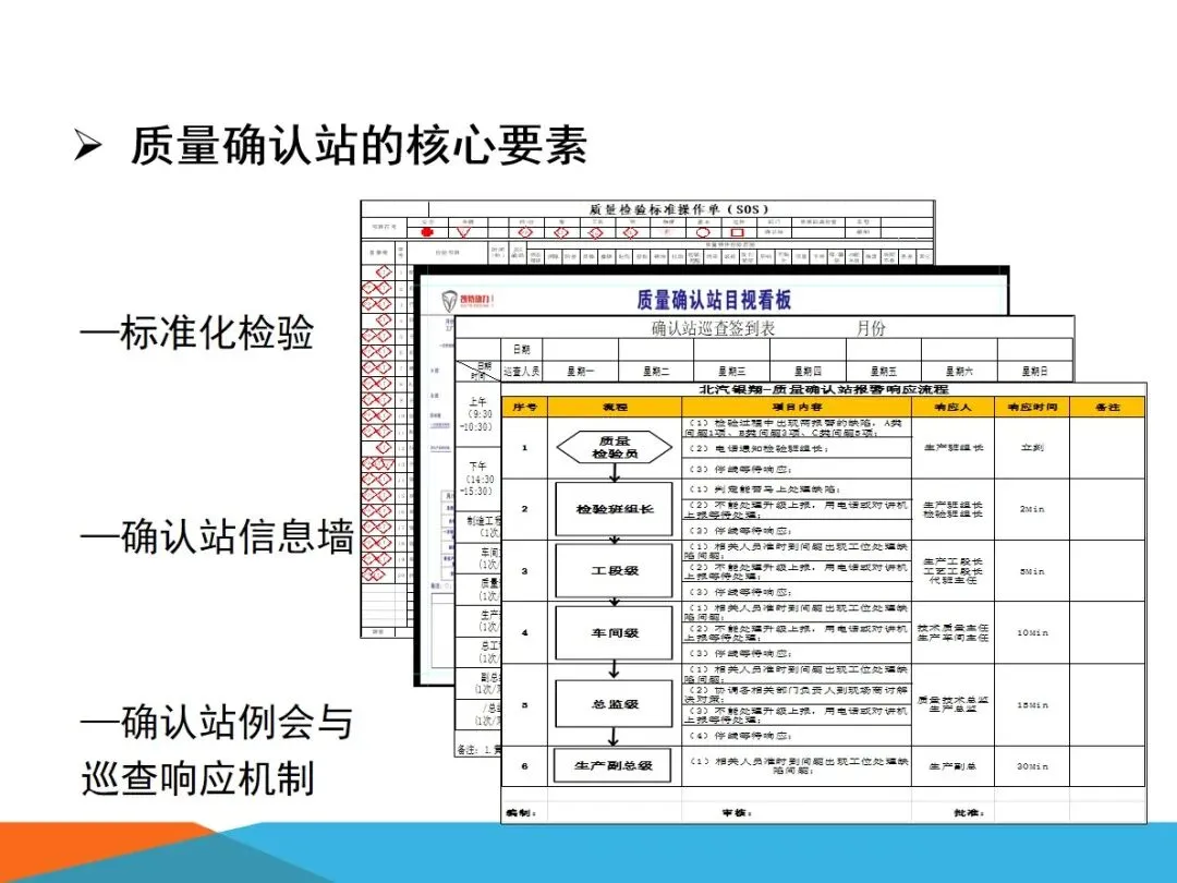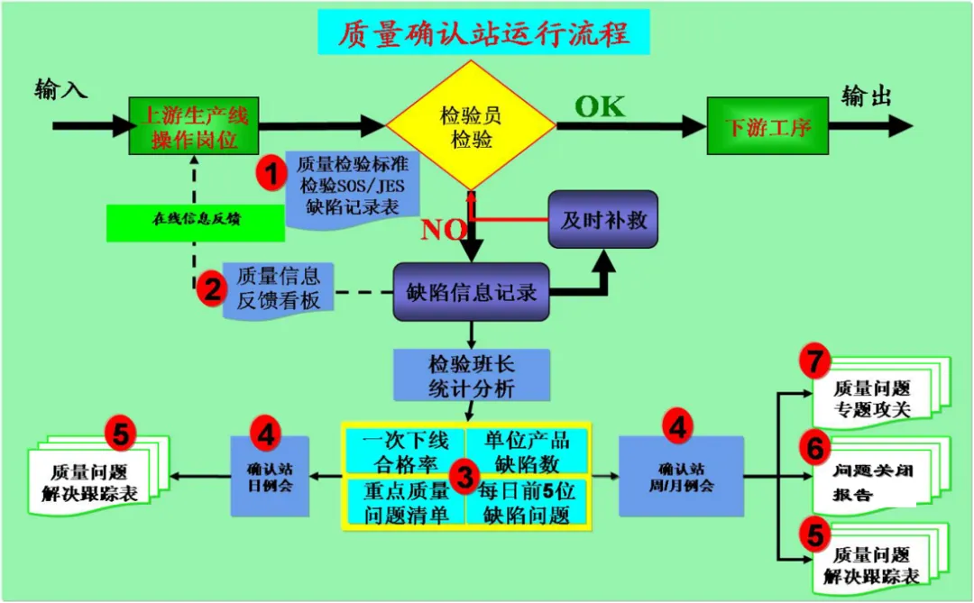 质量确认站的核心业务,主要集中在四个方面:对生产过程中出现的缺陷进行检验,确保向内外顾客提供的产品没有任何质量隐患;根据SOS标准,对现场作业流程进行验证,确保检查作业的连贯性和正确性;将各个工作点的品质信息进行整合,形成可视化的展示,建立有效的工作场所的资讯互动平台;以现场质量问题为中心,进行有效的资源调配,将问题转化为规范的解决过程,最终实现产品的零缺陷。