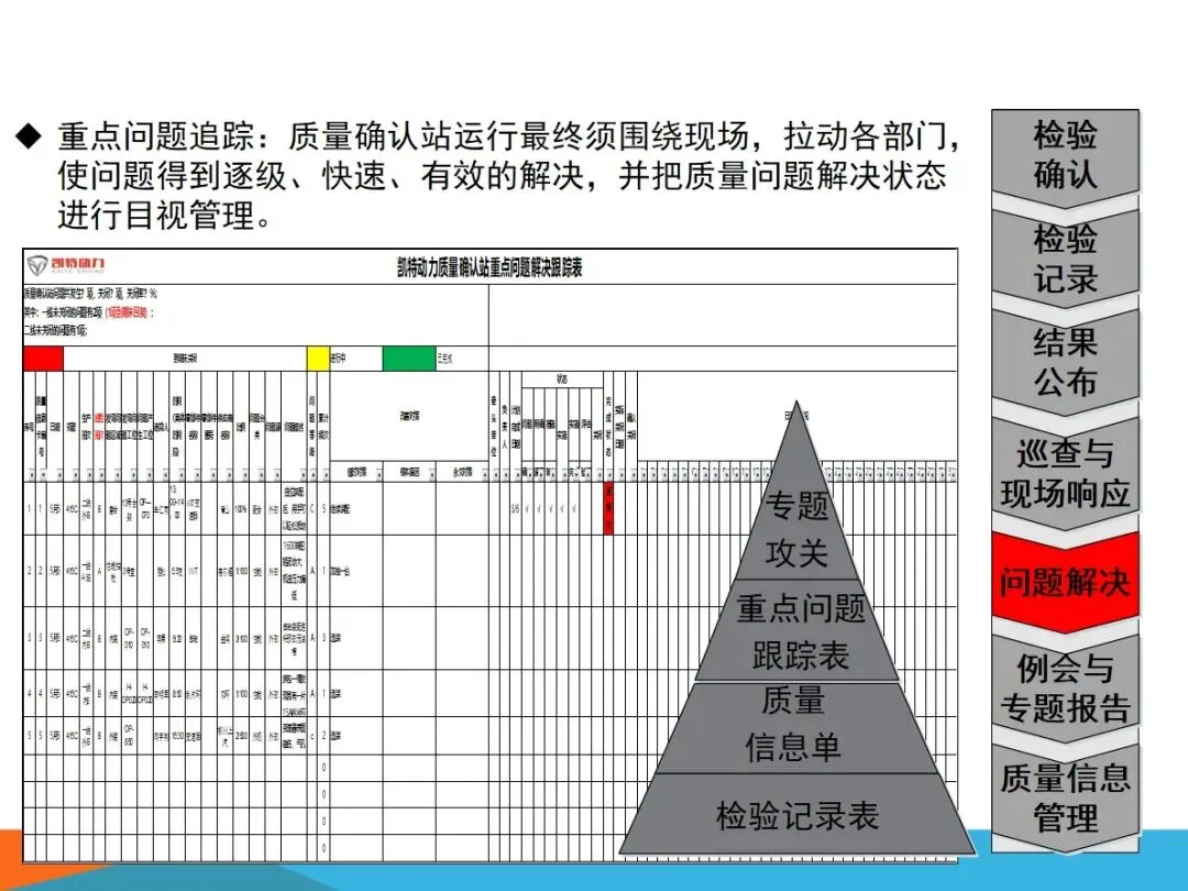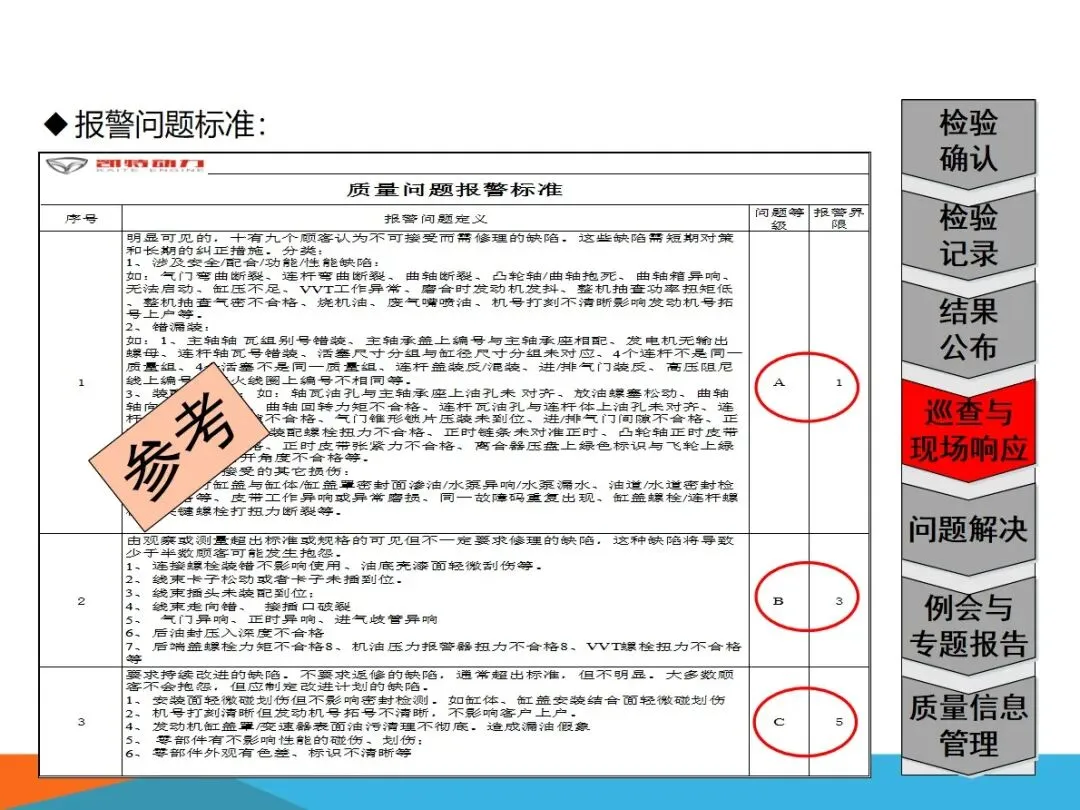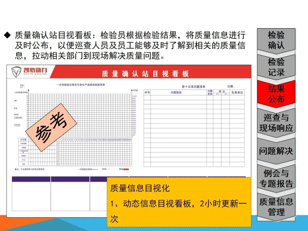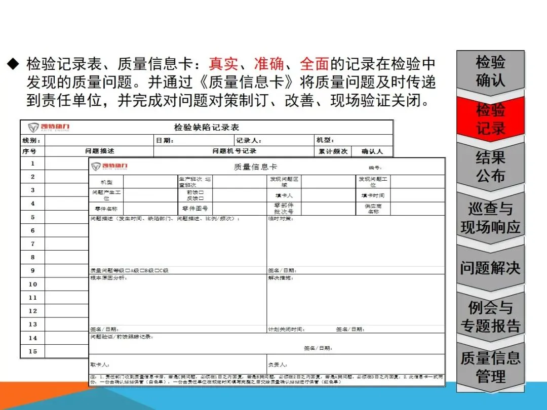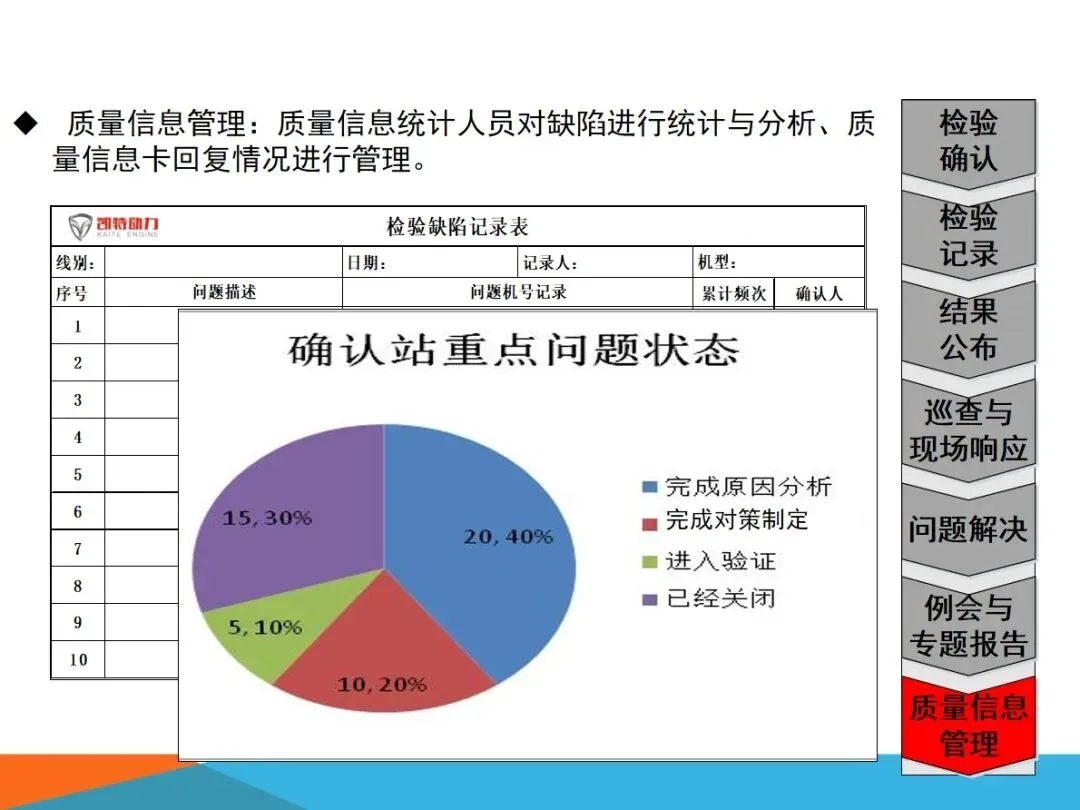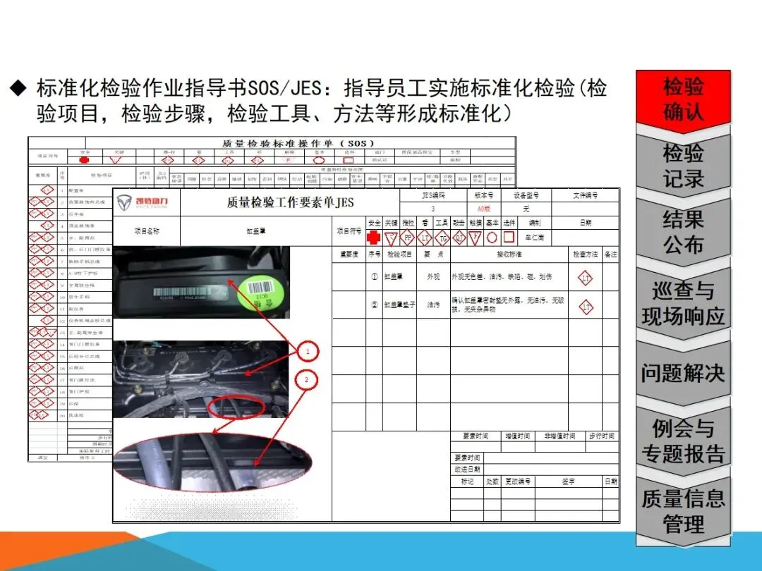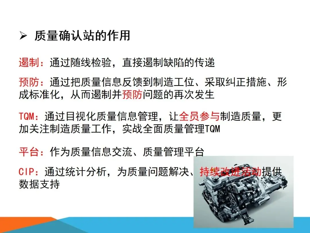质量确认站的核心业务,主要集中在四个方面:对生产过程中出现的缺陷进行检验,确保向内外顾客提供的产品没有任何质量隐患;根据SOS标准,对现场作业流程进行验证,确保检查作业的连贯性和正确性;将各个工作点的品质信息进行整合,形成可视化的展示,建立有效的工作场所的资讯互动平台;以现场质量问题为中心,进行有效的资源调配,将问题转化为规范的解决过程,最终实现产品的零缺陷。