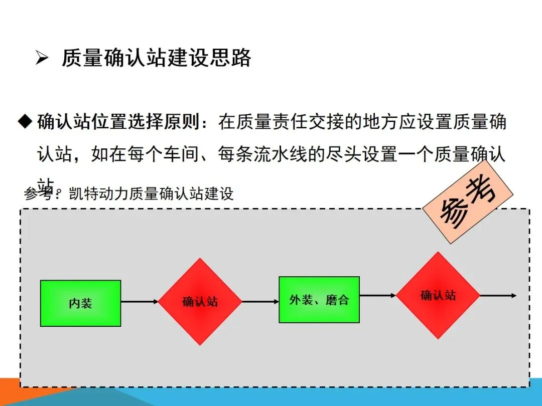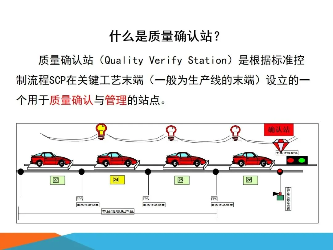 质量确认站是以SCP为基础,设置在关键工序的终端,特别是在生产线的终端,进行质量确认和质量管理的现场工位,是工厂实施“零缺陷”、“三不”等品质管理思想的重要的现场手段。它的建立应以建立质量管理的交错点为原则,在每一个车间,每一条流水线的末端,都要有这样的地方,使质量管理能够落实到制造场地的各个重要环节。