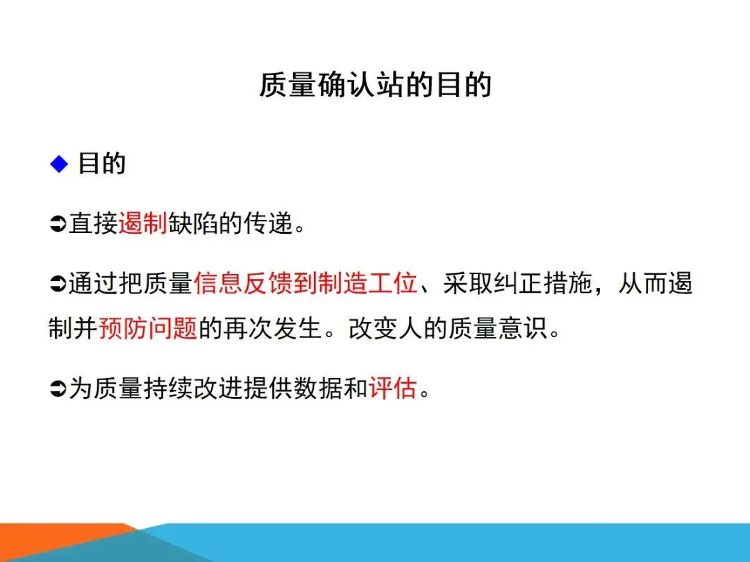 建立质量确认站,其核心目的是达到“三级控制”的目的:第一,在制造过程中,直接控制缺陷的传递,在工作站这一环节上控制质量,防止缺陷流入到下道工序;二是及时地将在生产现场检测到的产品质量信息反馈给生产车间,促使生产车间及时采取相应的整改措施,杜绝问题的反复出现,并使生产一线人员的产品质量观念逐渐改变;三是对现场质量状况进行真实、全面的采集,为企业的质量管理、质量改善、质量控制、质量评价等提供准确的信息支持。