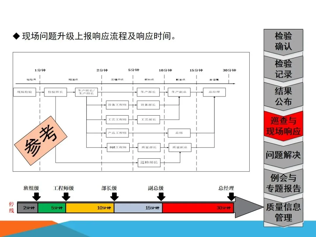 站点的运行以标准化检验为基础,以确认站的信息墙为依托,以例会和巡查制度为依托。检查部分有SOS和JES的工作指令,要求严格执行,检查结果需要及时录入,并在两个工作时间内进行视觉检查面板的刷新;建立定期巡视、信息前馈和反馈制度,及时将质量问题反馈到相关岗位。此外,该站点建立了问题级别预警机制,发现 A 类问题 1 例、B 类问题 3 例或 C 类问题 5 例时立即报警,问题升级响应按班组级 2 分钟、工程师级 5 分钟等时限要求逐级上报,保障现场问题快速处置。