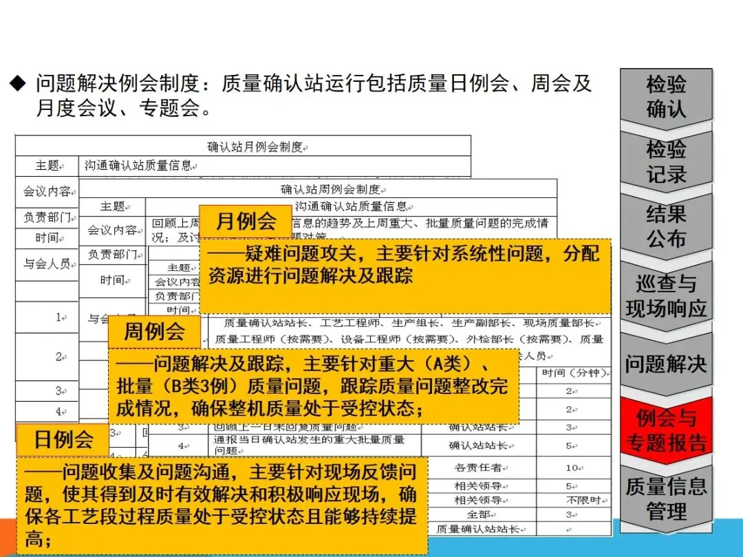 为实现质量管理的闭环控制,质量检验站实行日,周,月例会管理,日例会及时处理现场出现的质量问题;周例会跟踪重大批量质量问题的处理情况;该模型不但能将全员参与的TQM落实到生产现场,而且还能建立起“检查—记录—响应—解决—再回顾”的闭环控制体系,为企业品质的不断改善奠定基础,是“零浪费”和“零缺陷”的重要保证。