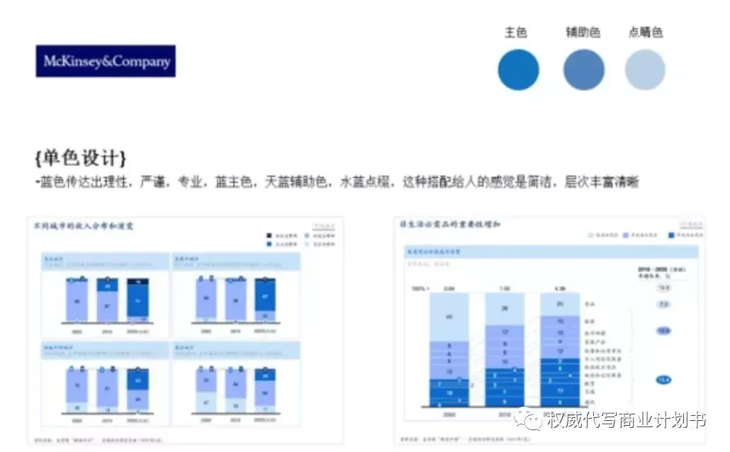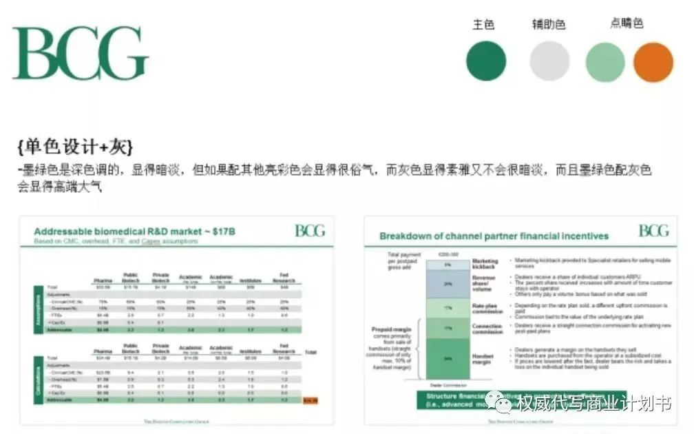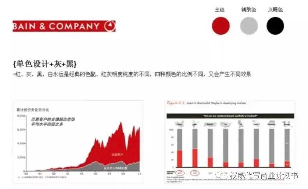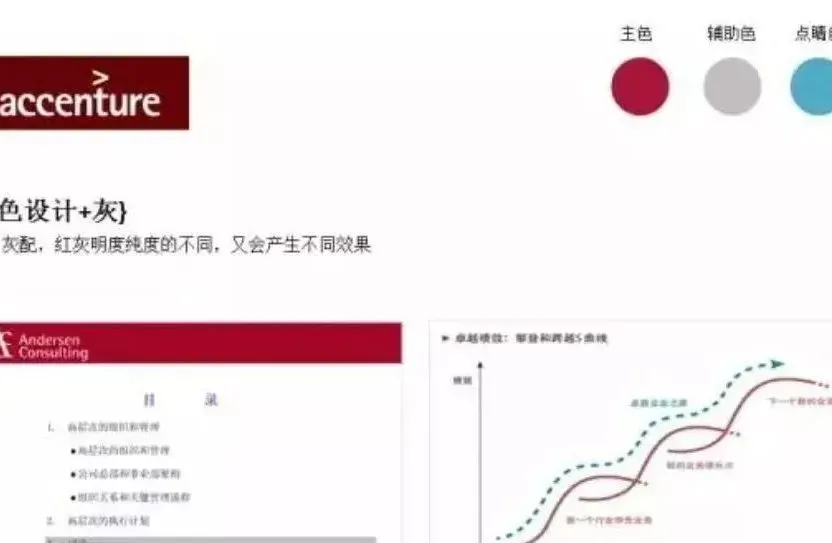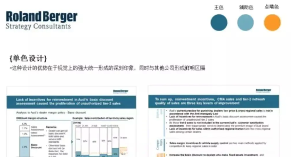 麦肯锡公司选用的是单色设计。蓝色作为主色,天蓝辅助色,水蓝点缀。这种搭配给人的感觉是简洁,层次清晰。贝恩公司的PPT主要用红色贯穿前后。除了红色之外,还搭配了浅灰色,黑色两种无彩色。浅灰作为辅助色,黑色则起到了点缀的作用。BCG的PPT中,以墨绿为主色调,浅灰色为辅助色,点缀浅绿,橙色等近似色,营造出一种高端大气的感觉。埃森哲最新的PPT模板中,主要有有深红色,灰色,采取的也是单色设计。不过埃森哲的PPT色彩管理并不统一,还有蓝色,黄色,绿色等多种版本。罗兰贝格的PPT为两种不同层次的绿色搭配,分别为深青和水绿,深青为主色,水绿为辅助色,点缀以橙色。从上述顶级咨询公司的PPT模板来看,每家的PPT都采用的是单色设计,让整体的PPT从头到尾只有一种颜色或同一色系。这种设计的优势在于视觉上的强大统一形成的深刻印象,同时与其他公司形成鲜明区隔。