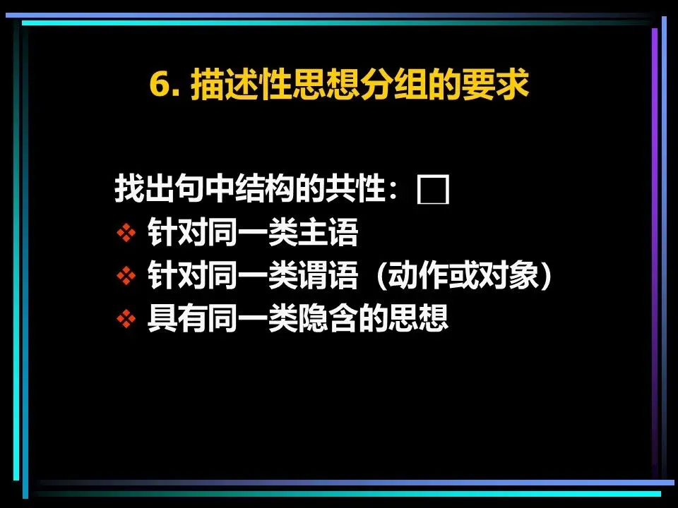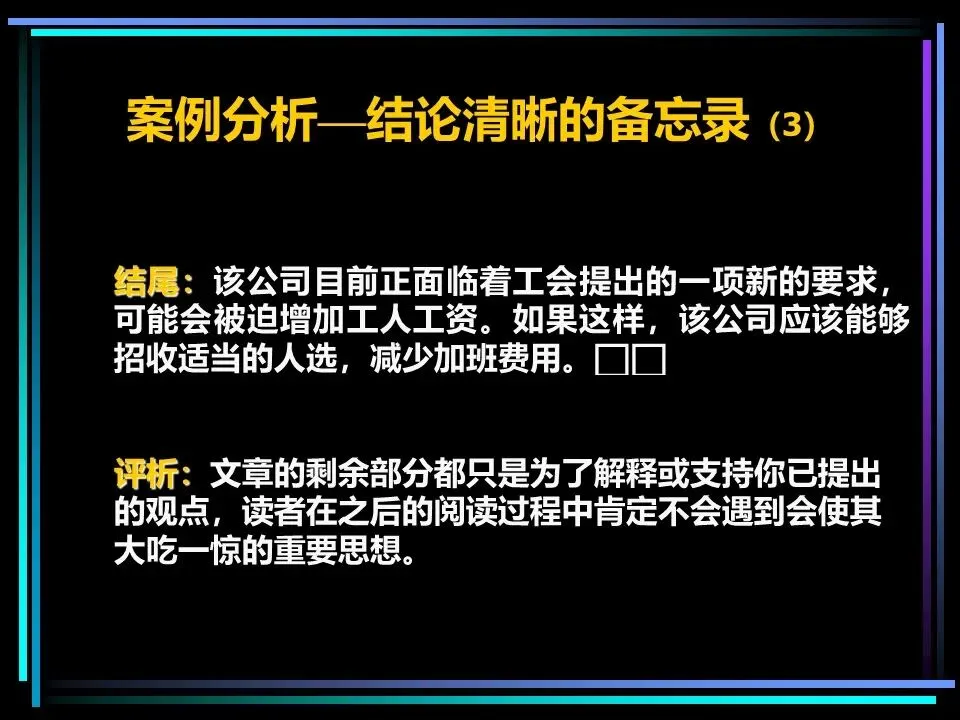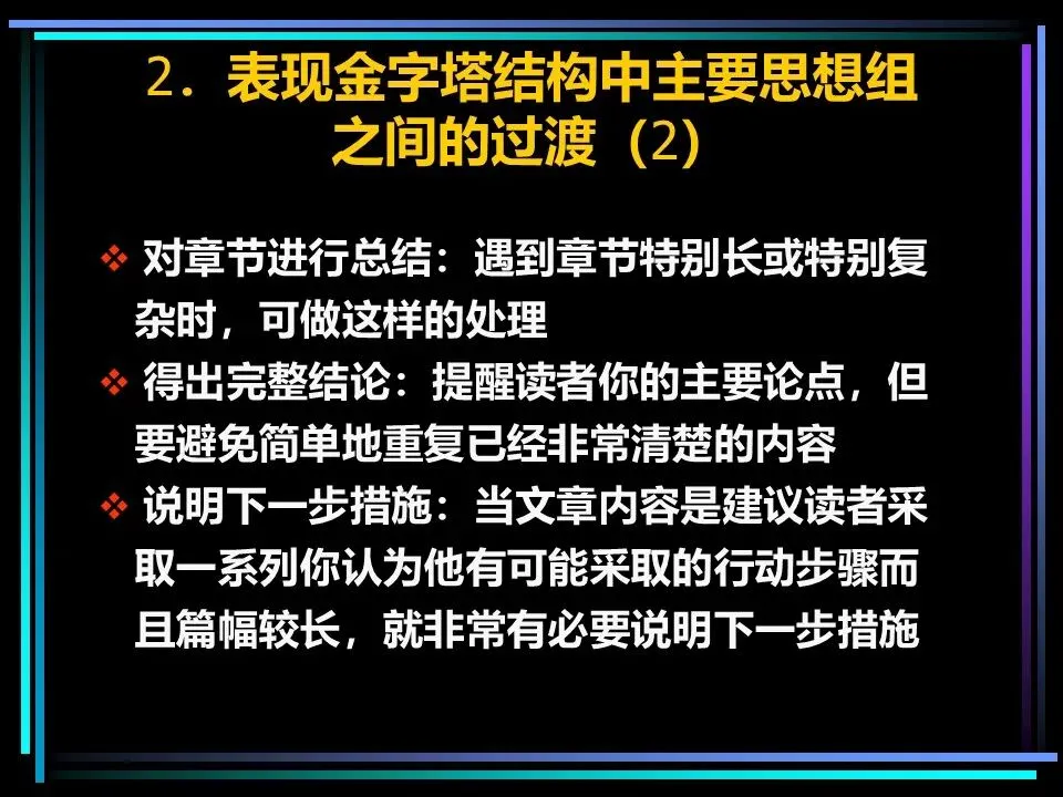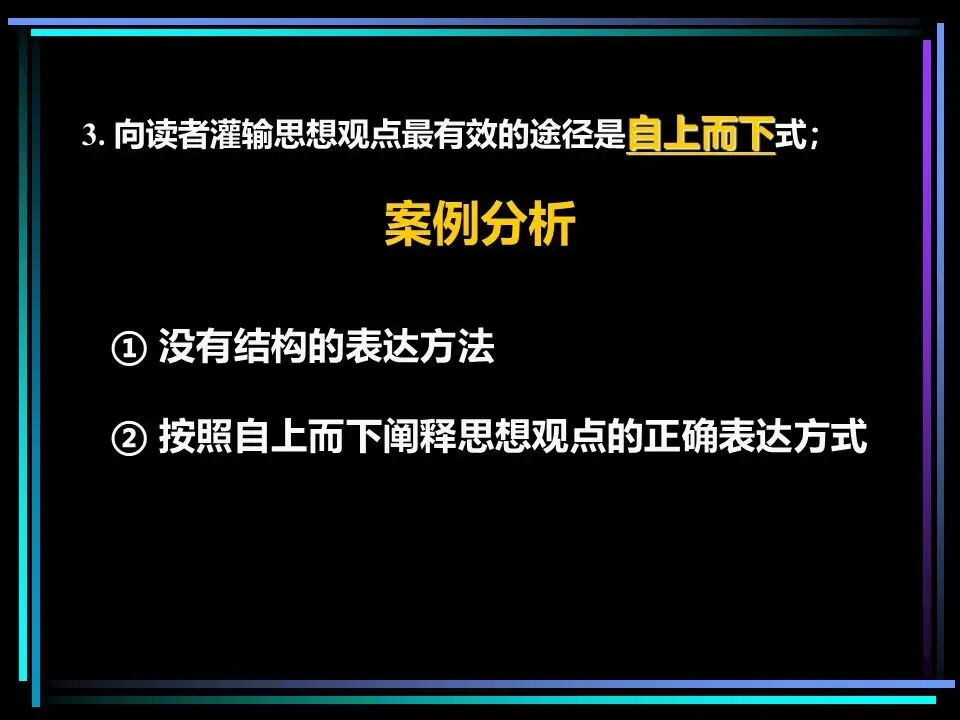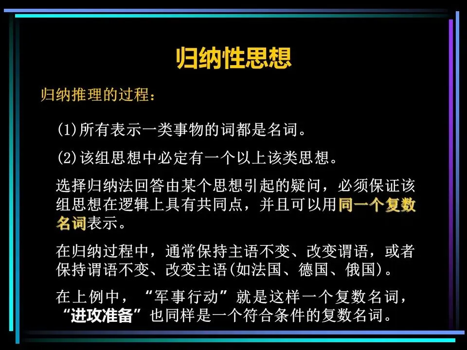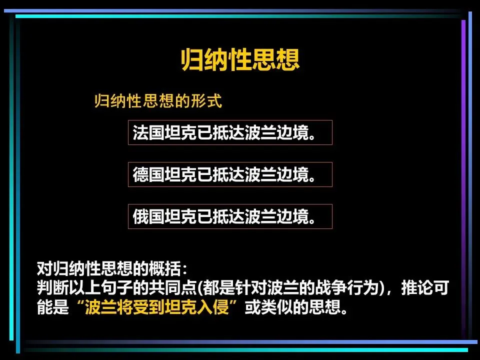 归纳法则是将相似的思想归为一组,提炼其共性,得出结论。比如“法国坦克已抵达波兰边境、德国坦克已抵达波兰边境、俄国坦克已抵达波兰边境”,可归纳出“波兰将受到坦克入侵”的结论,这种方式简洁直观,更易被读者理解,在关键句层次,归纳法往往是更优选择。