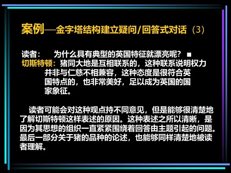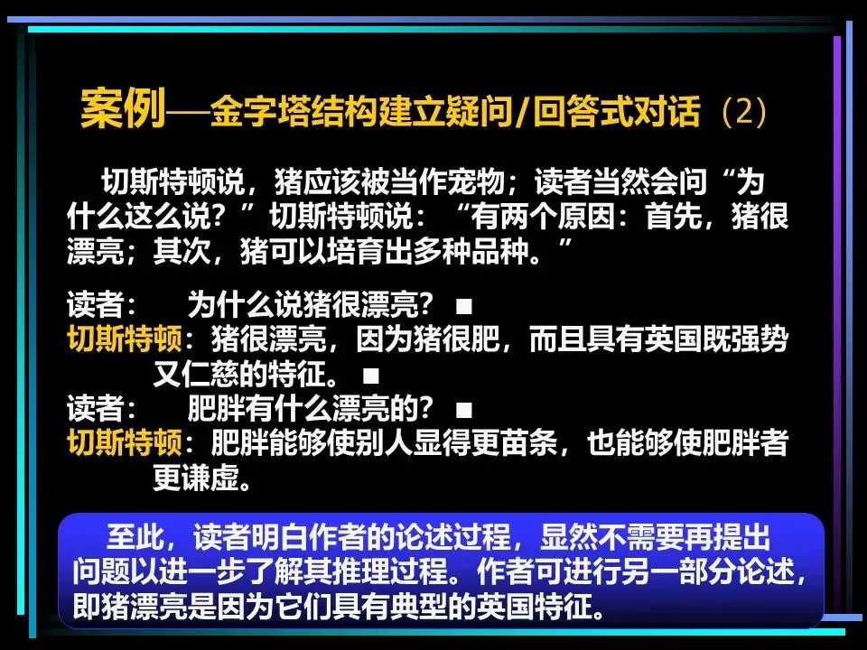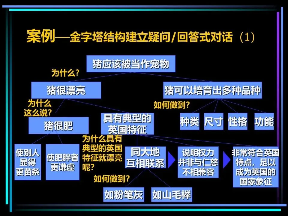 这一结构的核心原则是:每个句子都必须直接回答上一层思想引发的疑问,否则便失去了存在的意义。比如提出“猪应该被当作宠物”的观点,读者自然会问“为什么?”,便随即用“猪很漂亮、猪可以培育出多种品种”作答;针对“为什么猪很漂亮?”,再继续拆解为“猪很肥、具有典型的英国特征”等论据,层层回应,让逻辑闭环。