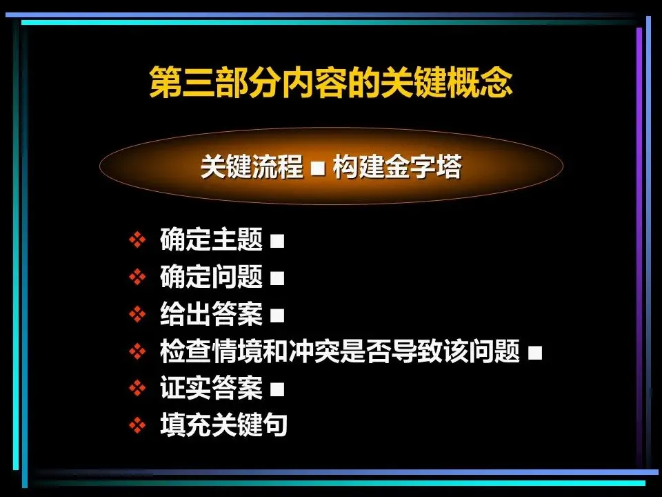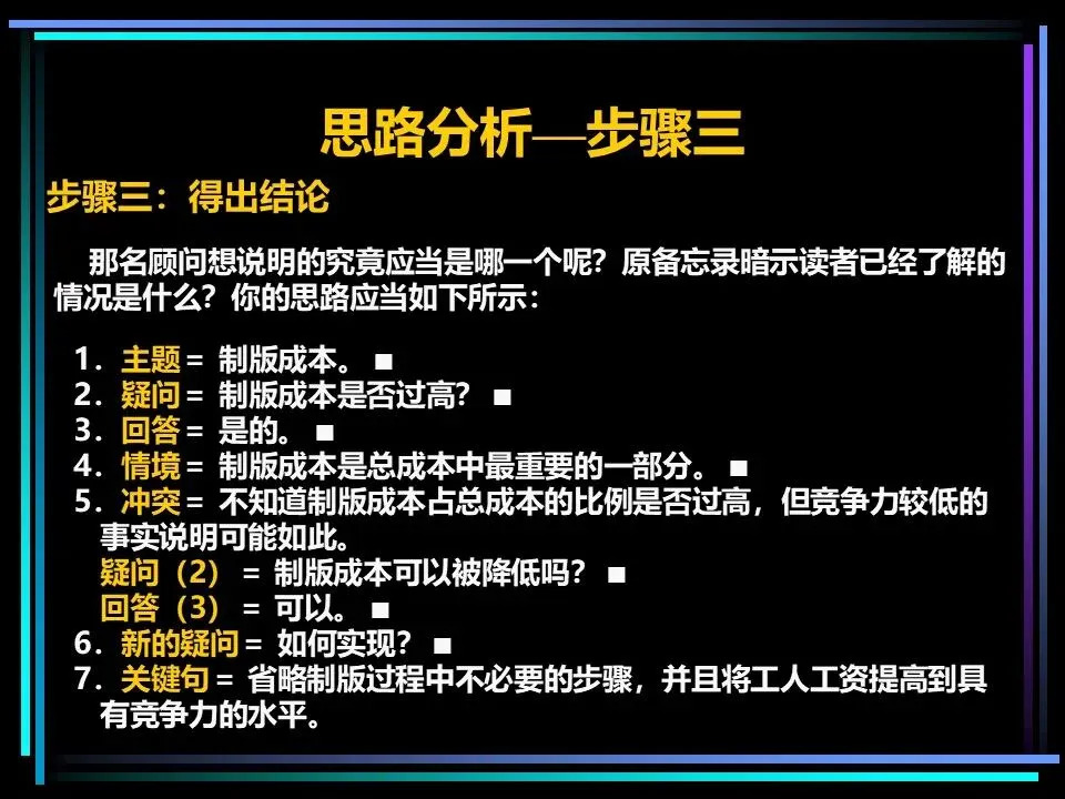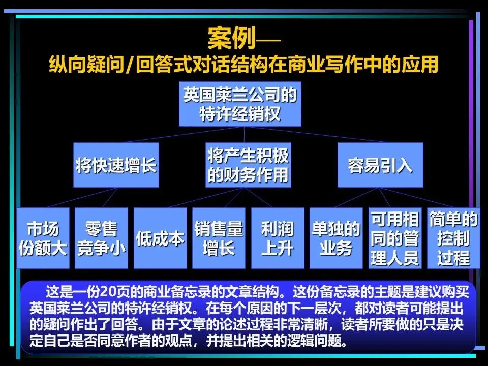 2.给出该问题的核心答案,即金字塔顶端的核心思想;3.梳理情境与冲突,将答案与读者已知的背景结合,验证问题与答案的合理性;4.列出核心答案引发的新问题,确定需要解答的关键疑问;6.针对每个关键句论点,继续拆解具体论据,直到能清晰说明问题,完成金字塔搭建。比如想要提出“建议购买英国莱兰公司的特许经销权”的观点,先给出这一核心结论,再针对读者的疑问“为什么值得购买?”,拆解为“业务将快速增长、能产生积极财务作用、容易引入”等论点,再针对每个论点继续拆解,让整个论证过程清晰完整。