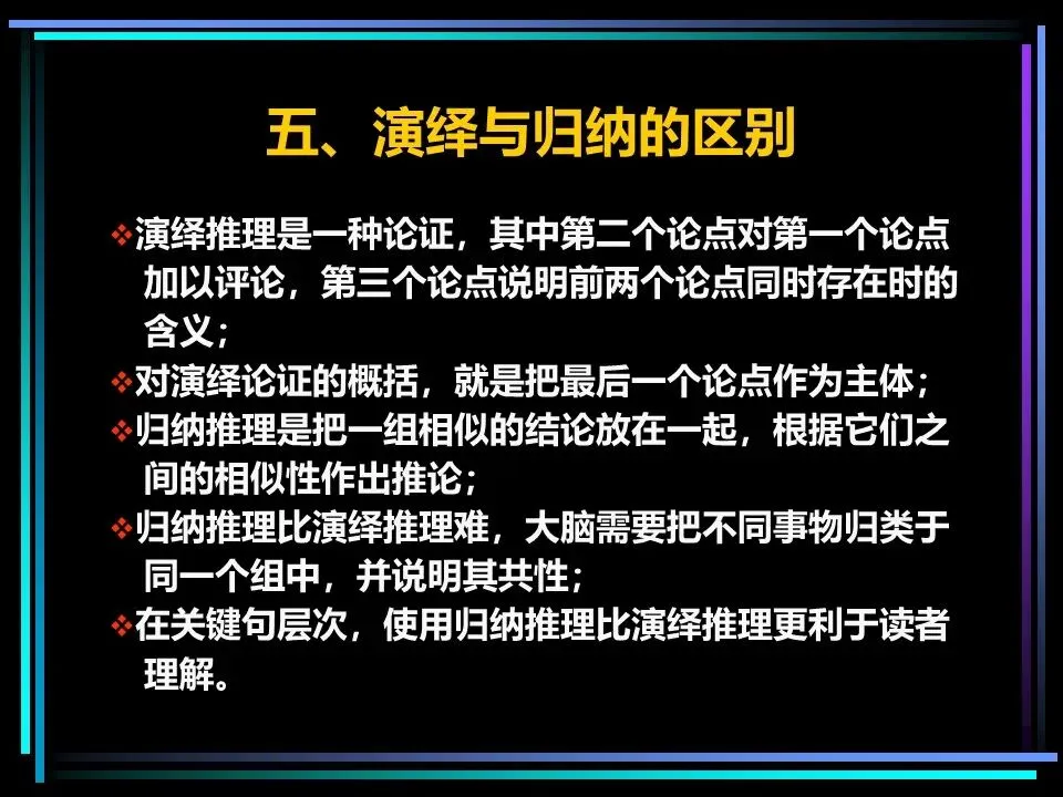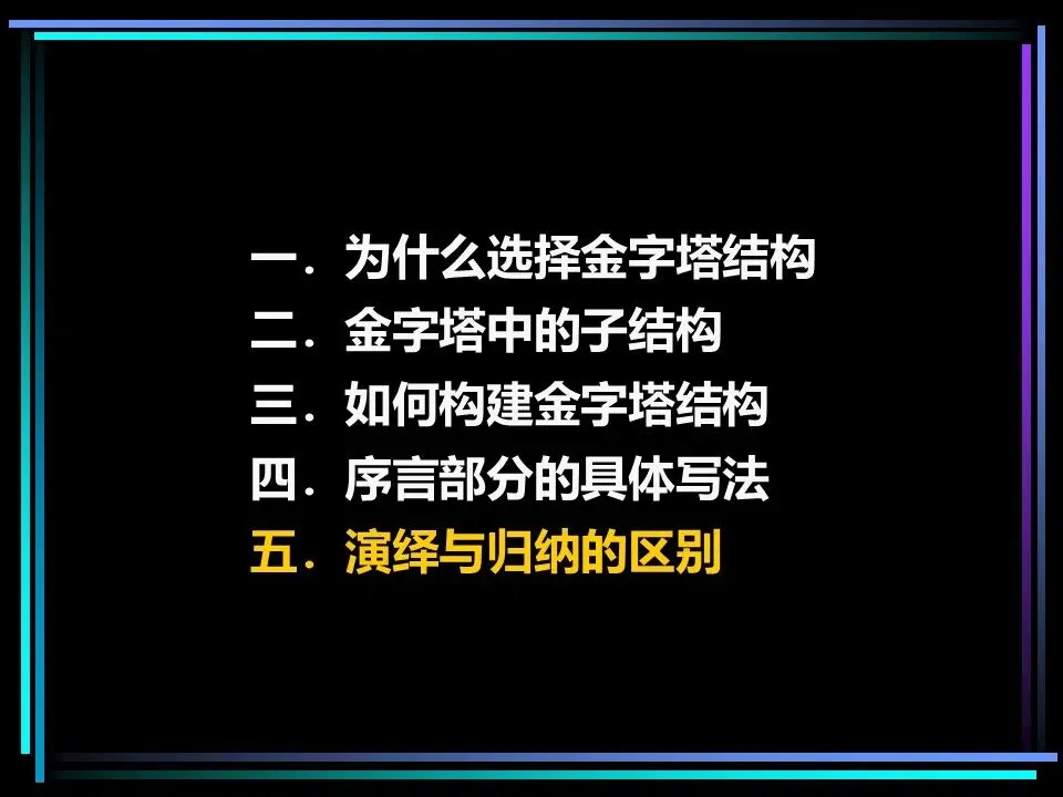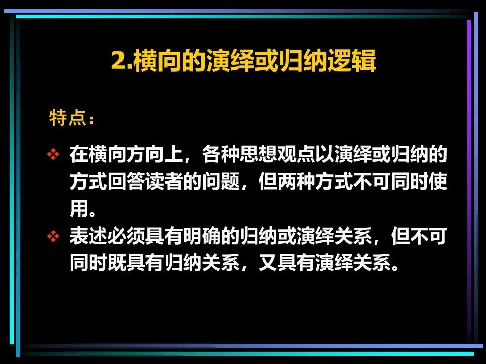 在横向维度,同一层次的思想之间,只能采用演绎法或归纳法中的一种,不可混用,这是保证逻辑严谨的关键。两种逻辑方式,适用于不同的表达场景,各有其价值。
