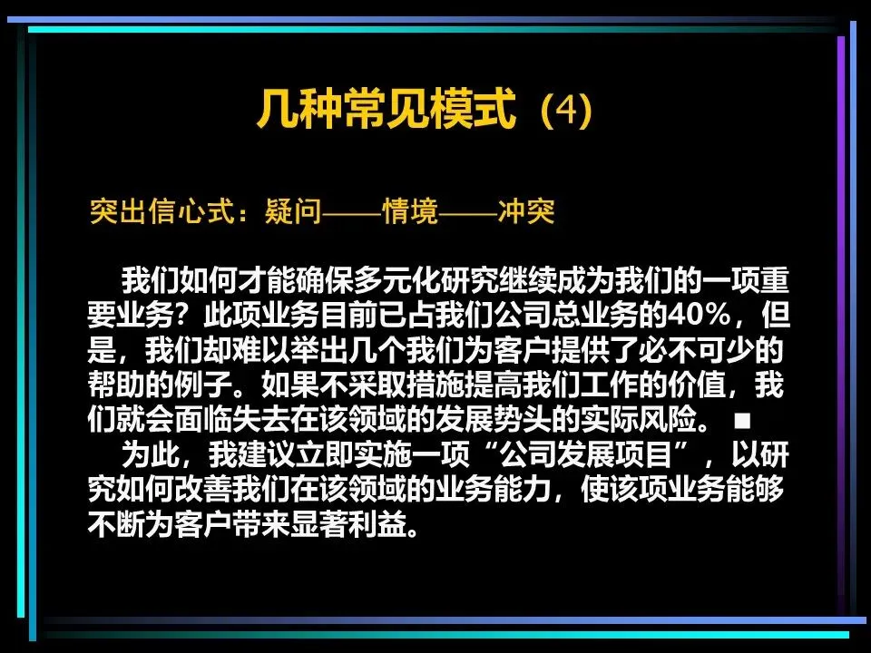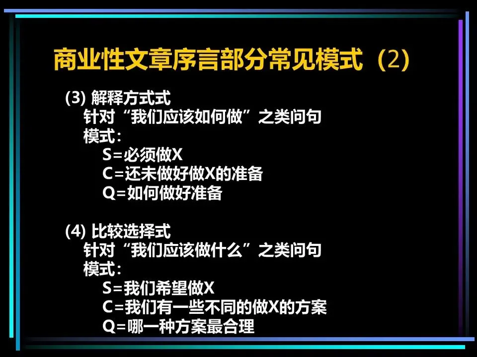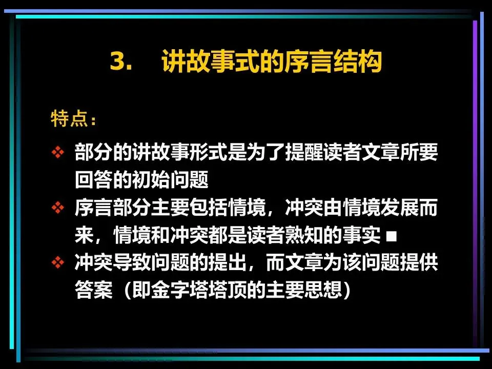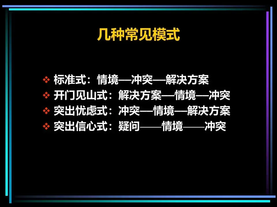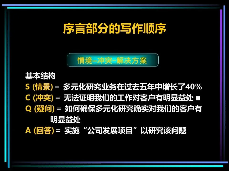 所有表达的开篇,都需要一个讲故事式的序言,由情境(S)、冲突(C)、疑问(Q)、答案(A)四部分构成,这是快速抓住读者注意力的关键。序言的作用是提示读者已知的事实,而非提供新信息,通过读者熟悉的背景,引出冲突与问题,最终给出核心答案,也就是金字塔顶端的核心思想。