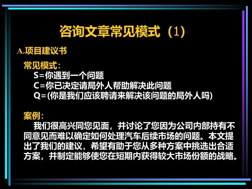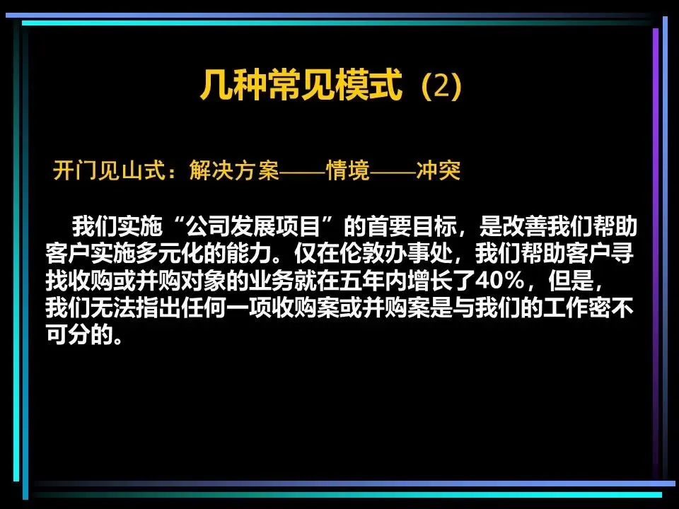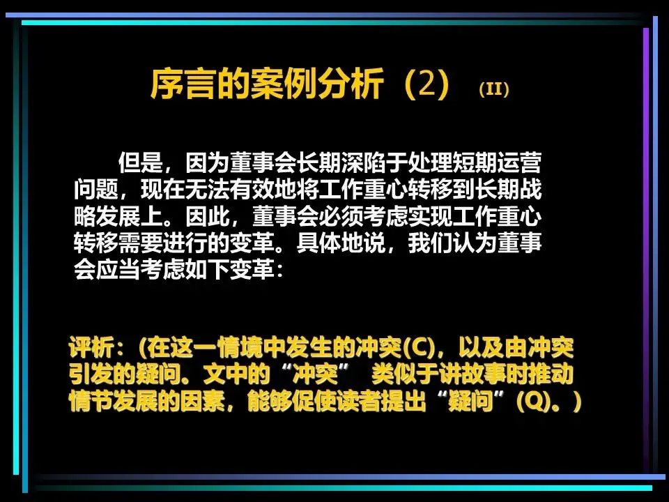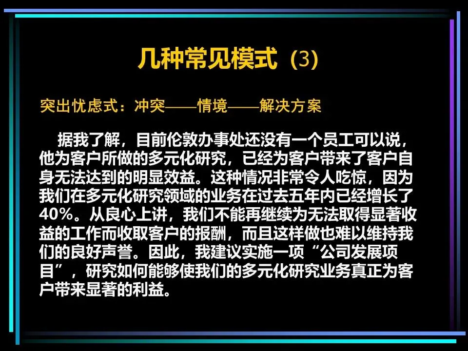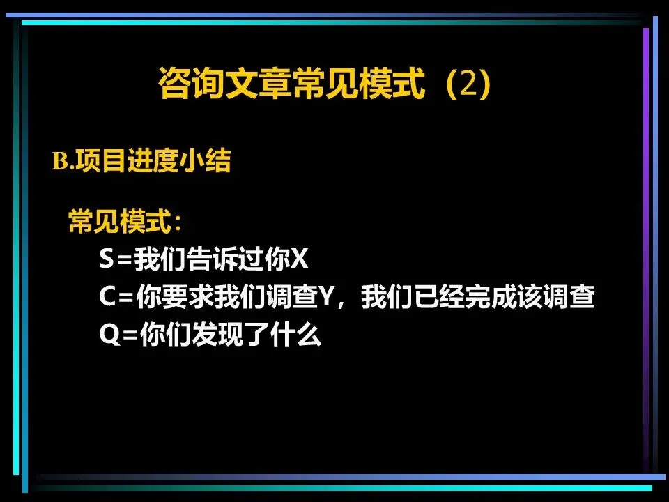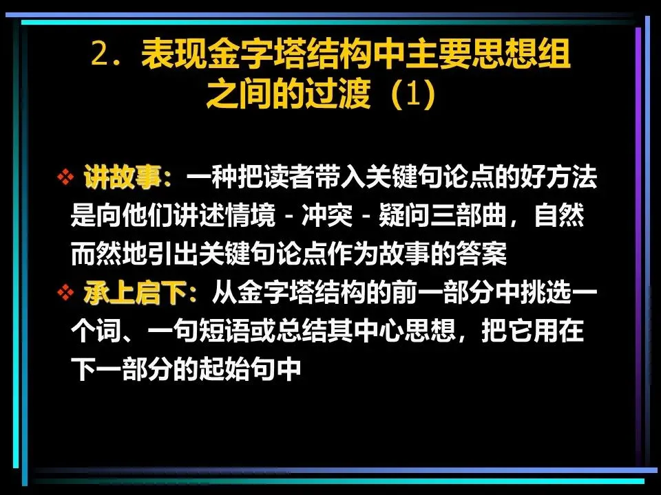 所有表达的开篇,都需要一个讲故事式的序言,由情境(S)、冲突(C)、疑问(Q)、答案(A)四部分构成,这是快速抓住读者注意力的关键。序言的作用是提示读者已知的事实,而非提供新信息,通过读者熟悉的背景,引出冲突与问题,最终给出核心答案,也就是金字塔顶端的核心思想。