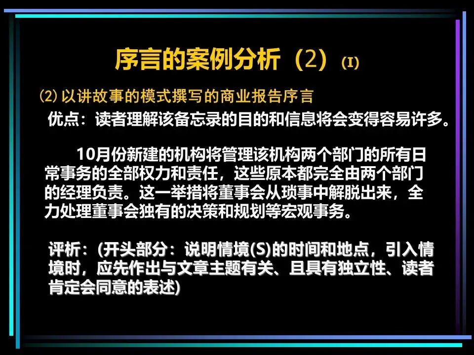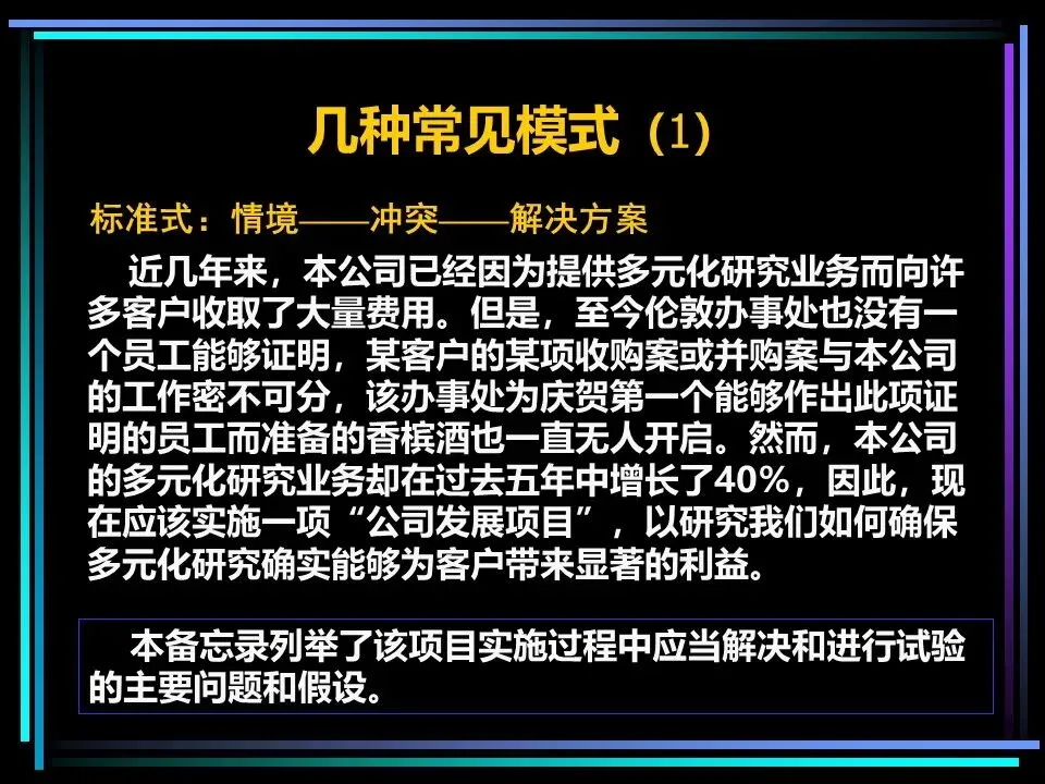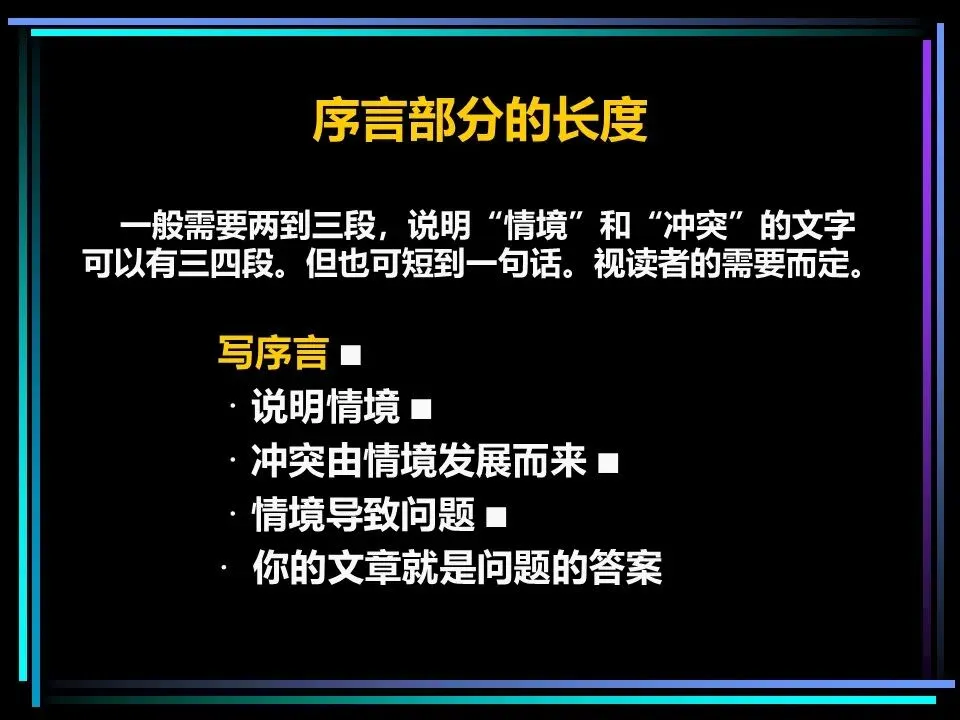 序言的写法可根据场景灵活调整:标准式(情境-冲突-解决方案)适合常规表达,开门见山式(解决方案-情境-冲突)适合需要快速突出核心的场景,突出忧虑式(冲突-情境-解决方案)适合强调问题紧迫性,突出信心式(疑问-情境-冲突)适合展现解决问题的底气。无论哪种方式,都能让读者在开篇就明白表达的核心目的,让后续的论述更有意义。
