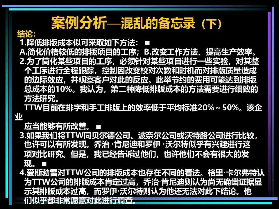 1.列出所有想要表达的思想、观点、问题,不做筛选,全面收集;2.分析各要点之间的逻辑关系,按因果、并列、从属等关系进行分组;3.从每组思想中提炼核心观点,再将各组的核心观点进一步归纳,得出金字塔顶端的核心结论,倒推搭建完整的金字塔结构。比如面对一份混乱的排版成本分析备忘录,先列出“排版效率低、工资偏低、人员短缺、工序无区分”等所有问题,再梳理出“低工资导致人员短缺,人员短缺导致效率低”的因果关系,最终提炼出“排版成本过高,可通过简化工序和提高工资解决”的核心结论,让思路从混乱走向清晰。