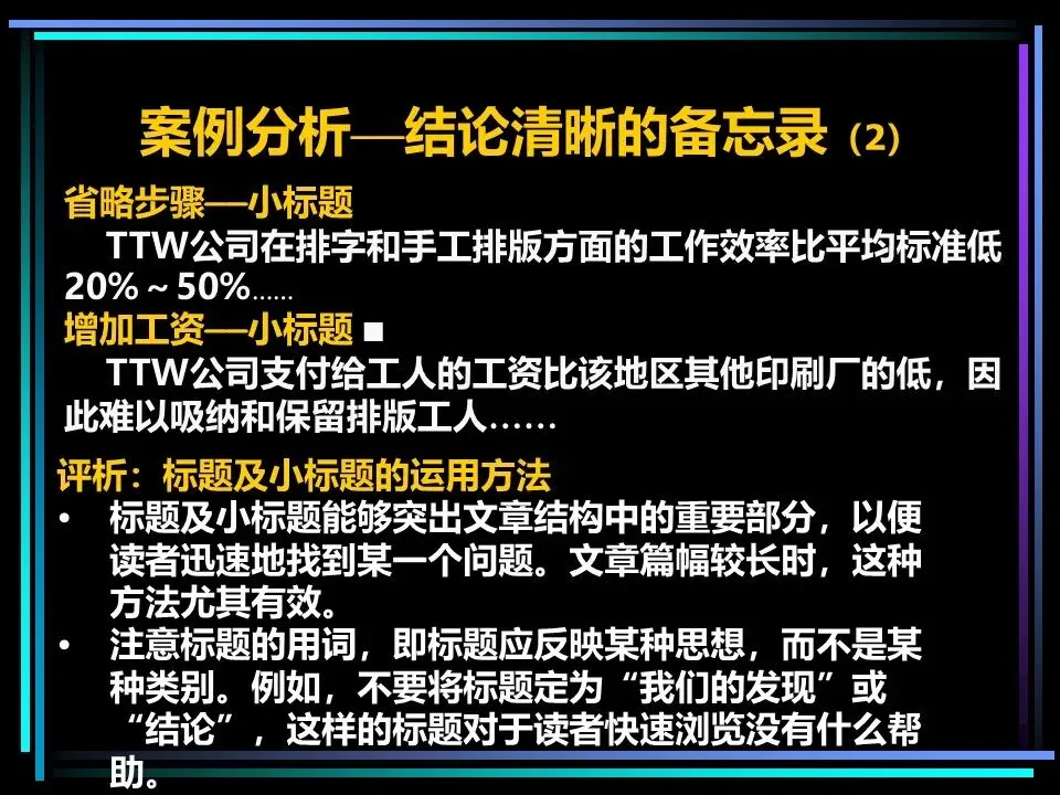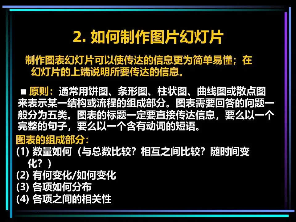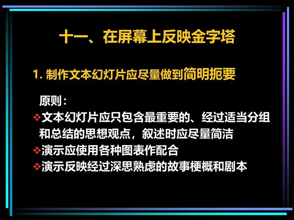 无论是PPT演示还是现场演讲,演示的核心是让观众快速抓住核心观点,金字塔原理能让演示的逻辑更清晰、表达更直观。制作文本幻灯片,要做到每页只讲一个论点,文字简洁、语句通俗,字号足够大,让观众一眼看清;制作图片幻灯片,要用饼图、条形图、曲线图等图表代替大段文字,标题直接传达核心信息,让数据更有说服力。