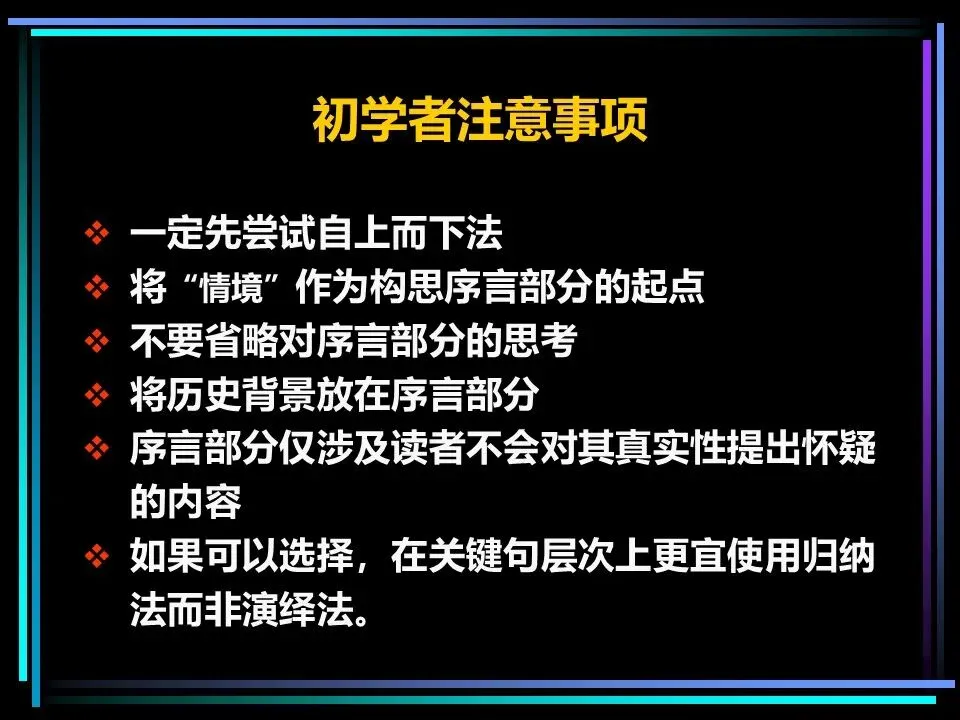 新手注意事项:优先尝试自上而下法,培养结论先行的思维习惯;将历史背景、无关信息放在序言,不混入核心论点;序言只包含读者不会质疑的事实;关键句层次优先使用归纳法,让表达更易理解。
