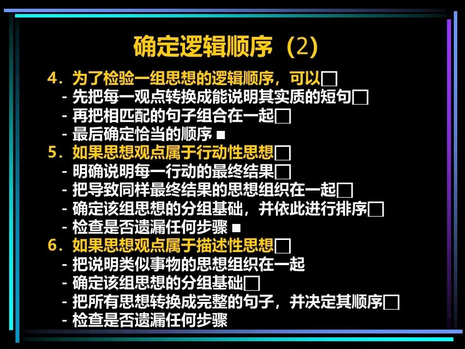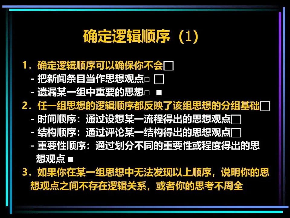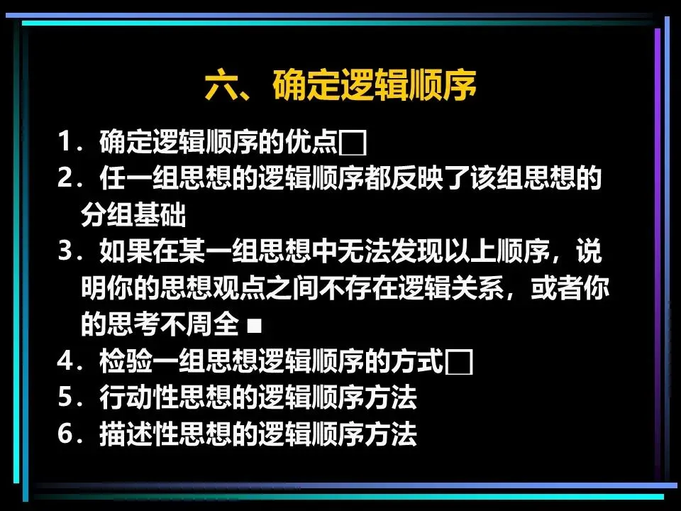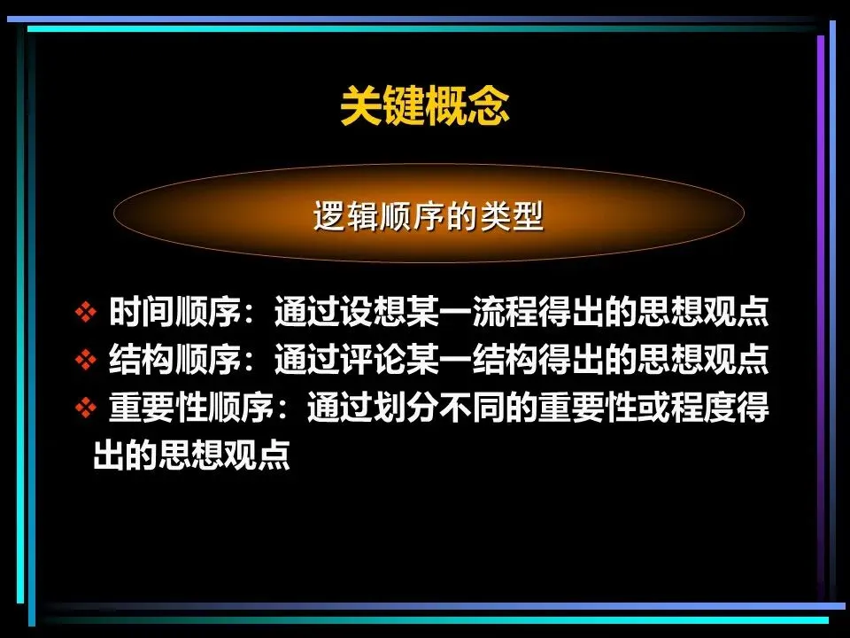 思考的混乱,本质是逻辑顺序的缺失和思想概括的模糊。金字塔原理要求,所有思想都必须遵循时间顺序、结构顺序、重要性顺序中的一种,时间顺序即按流程、步骤排列,结构顺序即按事物的组成部分排列,重要性顺序即按优先级、程度排列,找不到合适的顺序,便是思考尚未周全。