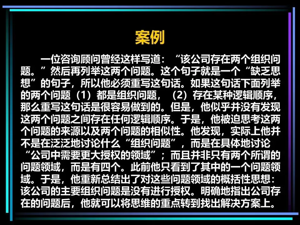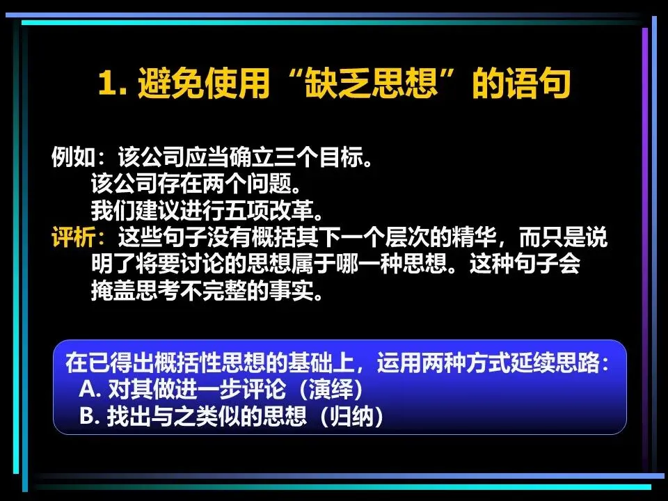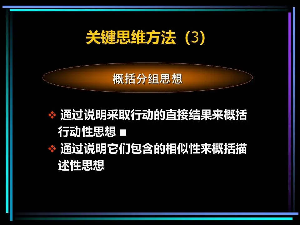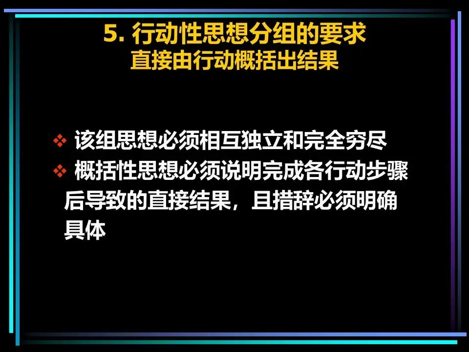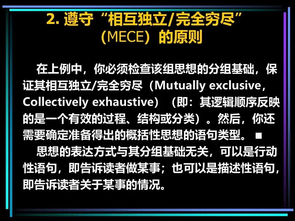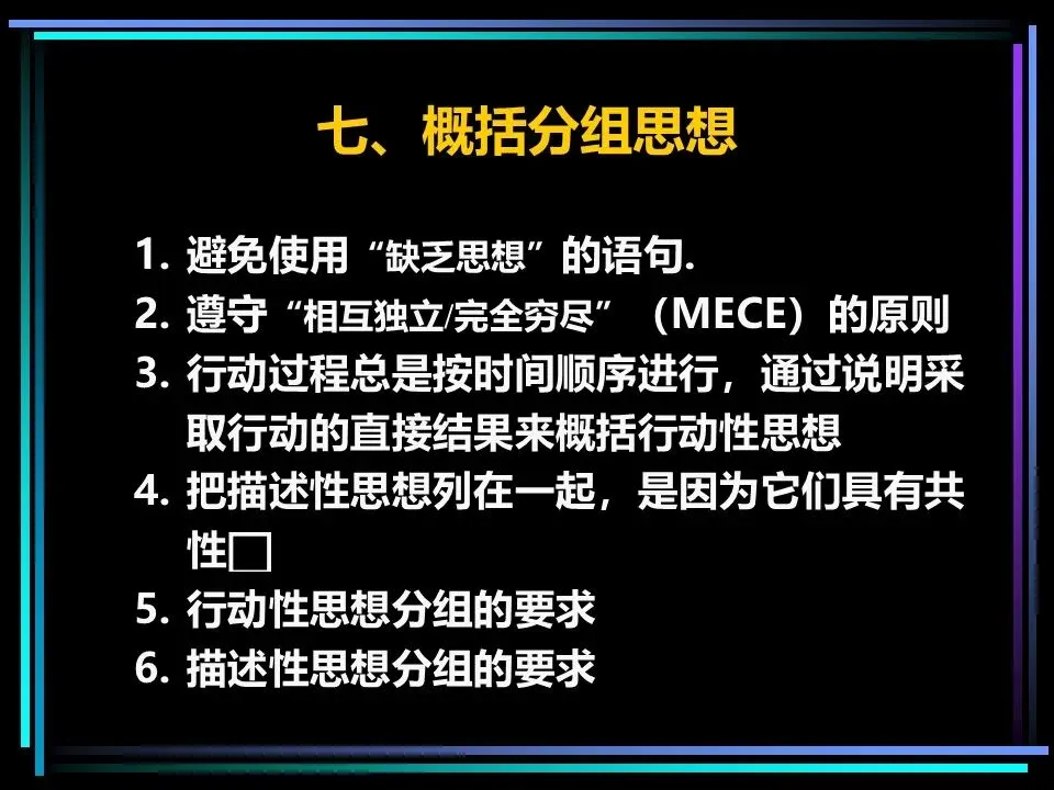 同时,概括分组思想时,要避开两个误区:一是避免使用“缺乏思想”的语句,比如“公司存在三个问题”“我们有五项措施”,这类语句未提炼核心,会掩盖思考的漏洞,应改为“公司的核心问题是组织授权不足”“我们将通过五项措施降低运营成本”;二是遵守MECE原则,即相互独立、完全穷尽,分组的思想既不重叠,也不遗漏,确保思考的全面性。