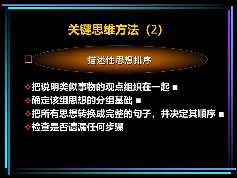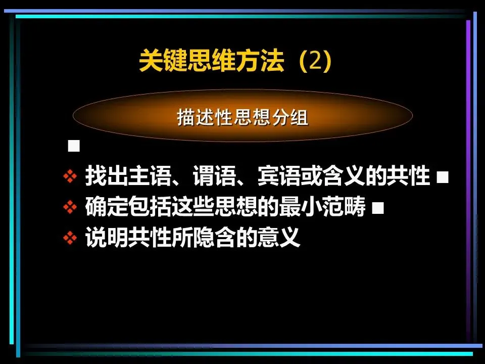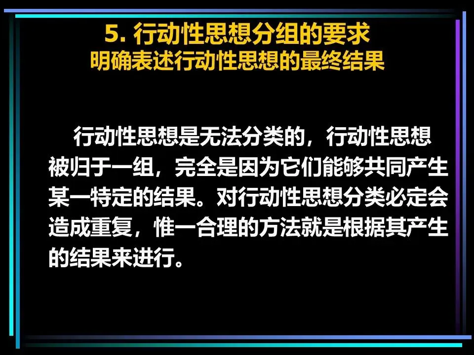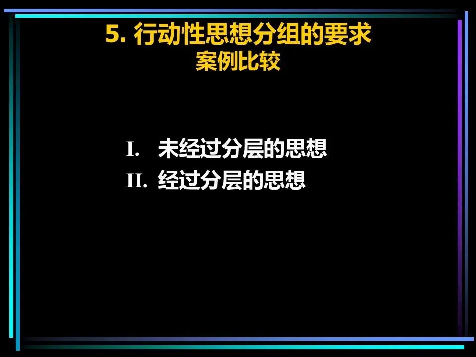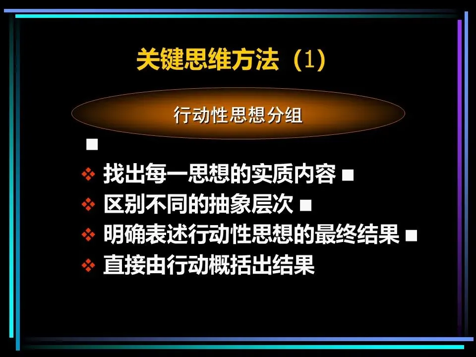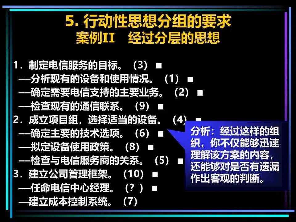 同时,概括分组思想时,要避开两个误区:一是避免使用“缺乏思想”的语句,比如“公司存在三个问题”“我们有五项措施”,这类语句未提炼核心,会掩盖思考的漏洞,应改为“公司的核心问题是组织授权不足”“我们将通过五项措施降低运营成本”;二是遵守MECE原则,即相互独立、完全穷尽,分组的思想既不重叠,也不遗漏,确保思考的全面性。