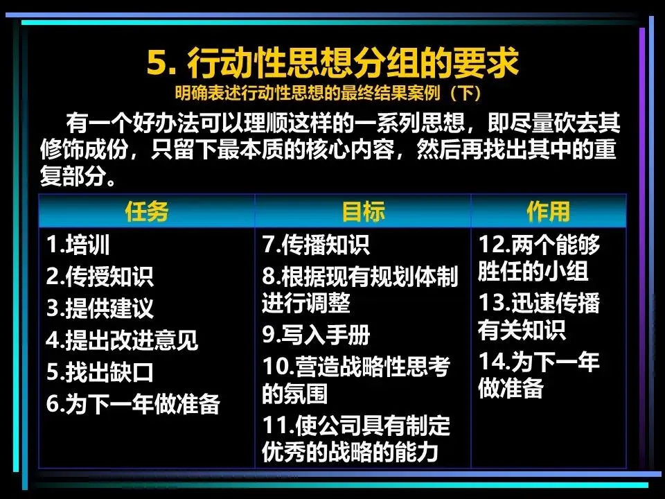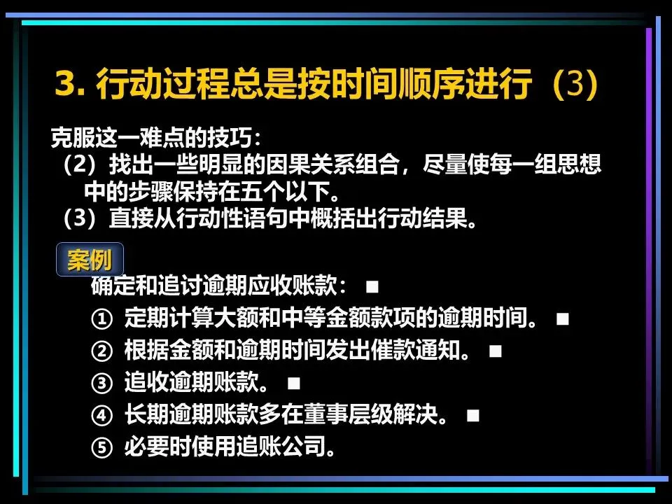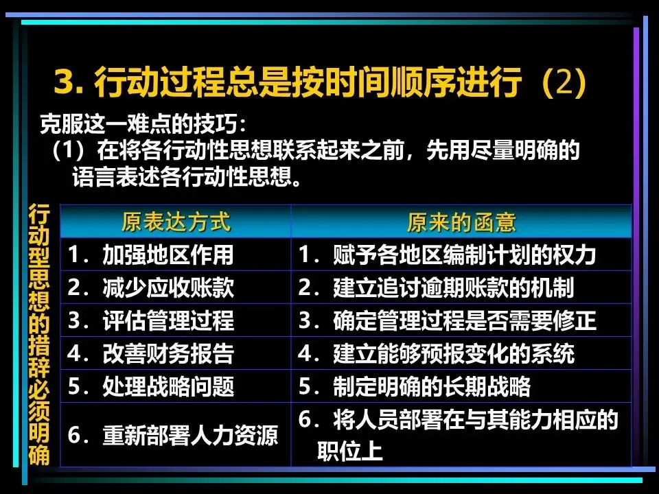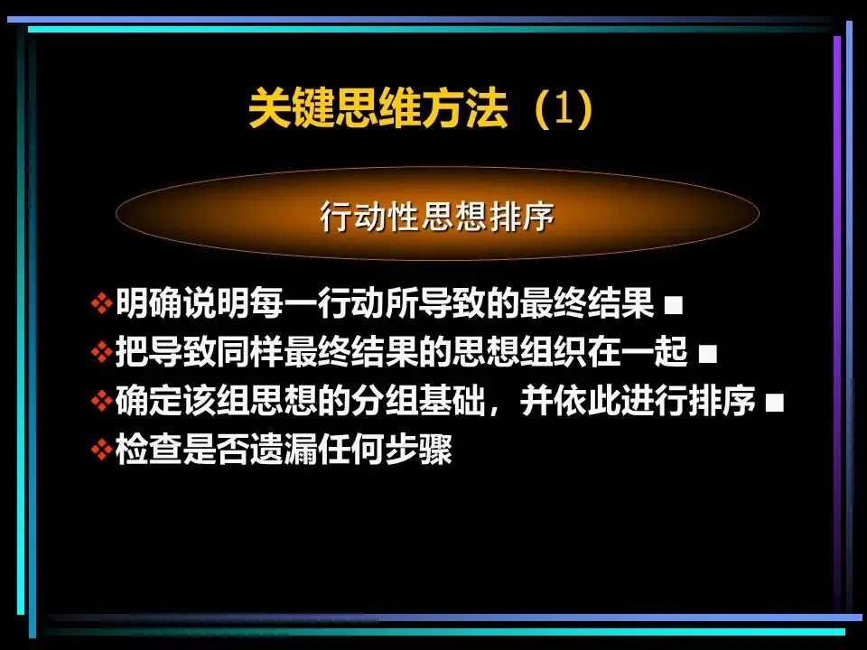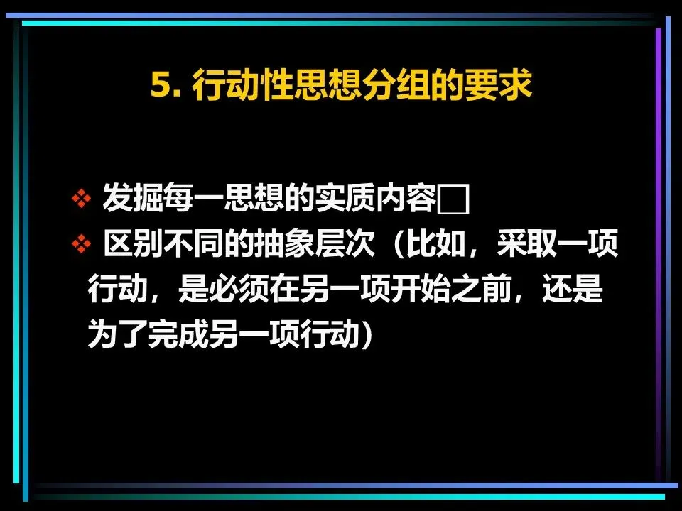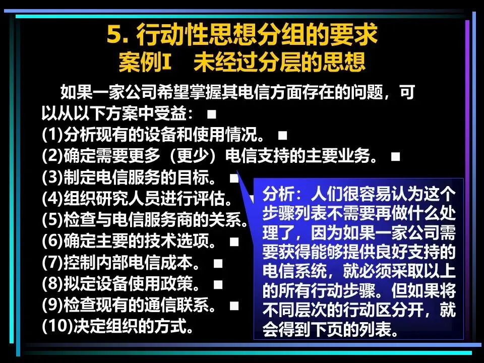 同时,概括分组思想时,要避开两个误区:一是避免使用“缺乏思想”的语句,比如“公司存在三个问题”“我们有五项措施”,这类语句未提炼核心,会掩盖思考的漏洞,应改为“公司的核心问题是组织授权不足”“我们将通过五项措施降低运营成本”;二是遵守MECE原则,即相互独立、完全穷尽,分组的思想既不重叠,也不遗漏,确保思考的全面性。