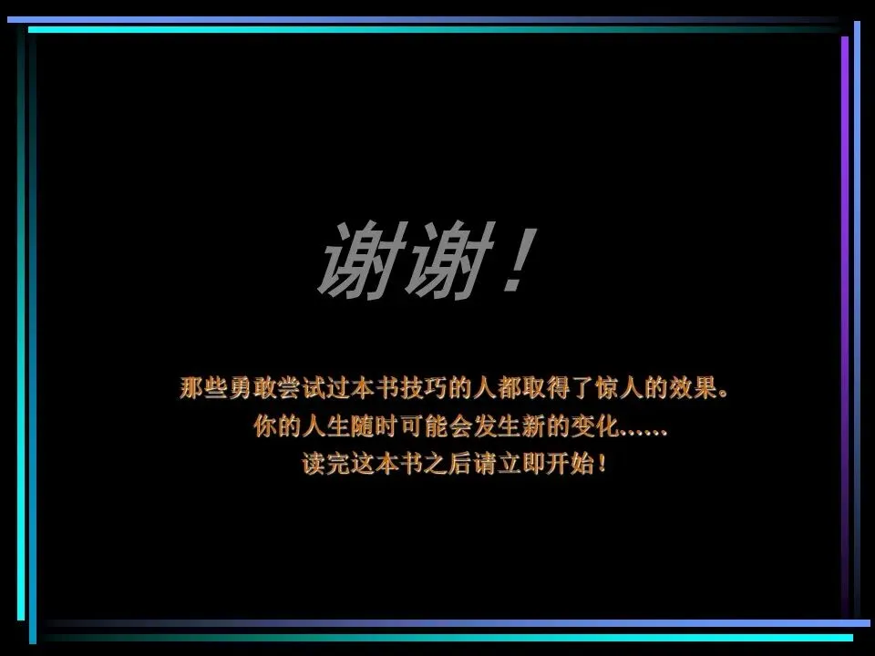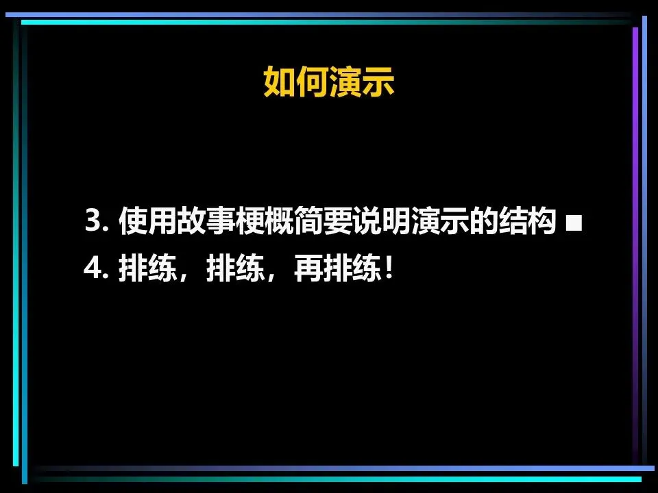 同时,用故事梗概梳理演示的整体结构,让演示的节奏符合“情境-冲突-解决方案”的逻辑;做好充分的排练,让表达更流畅,让演示的效果达到最佳。甚至在字里行间,可通过臆造图像的方式,先在脑中形成清晰的画面,再转化为文字,让表达更易懂,让观众的记忆更深刻。