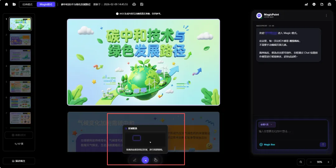 Magic模式的做法很直接:在PPT里圈出你想改的地方,然后对着对话框“告诉”AI你的想法。