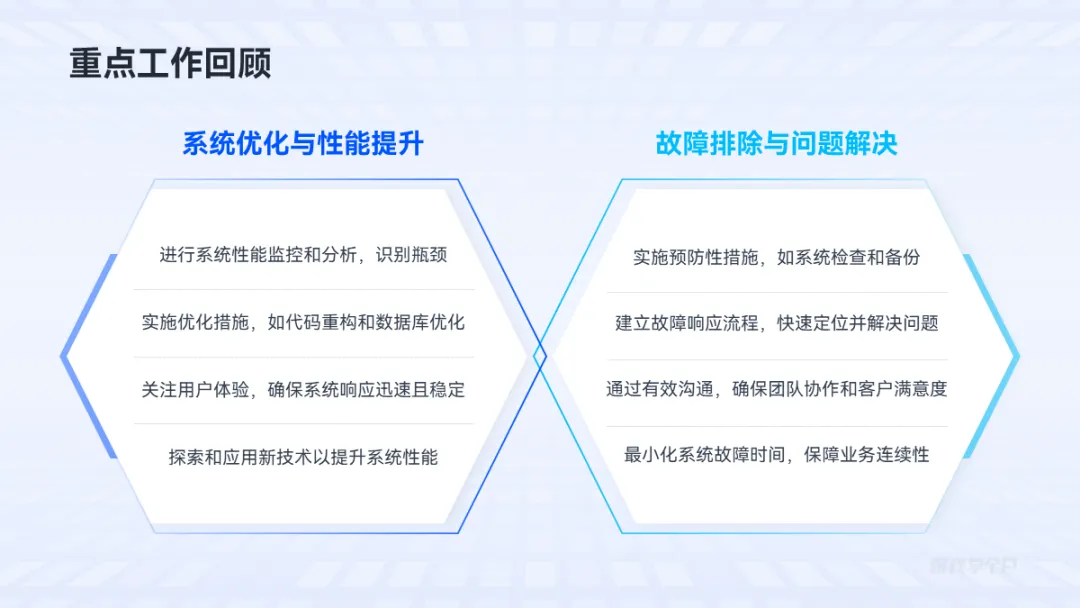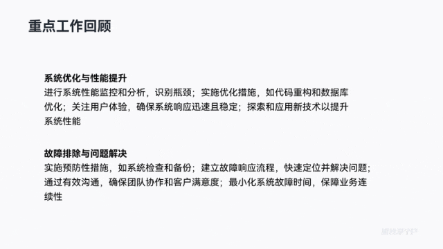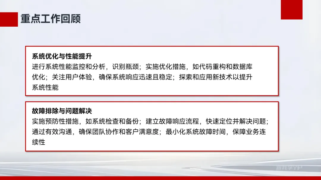 模板的内容分类非常齐全,包括了汇报PPT里必不可少的工作回顾、改进亮点、成果展示、逻辑模式等: