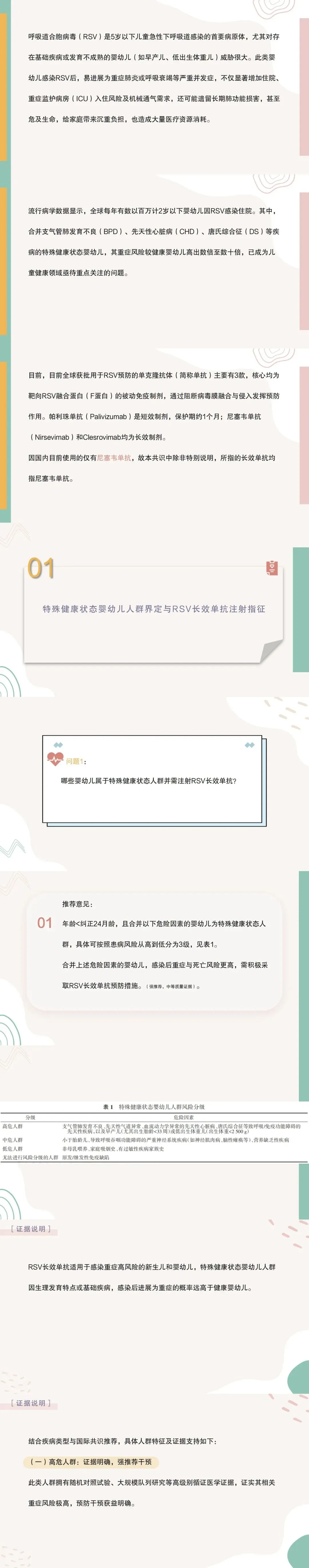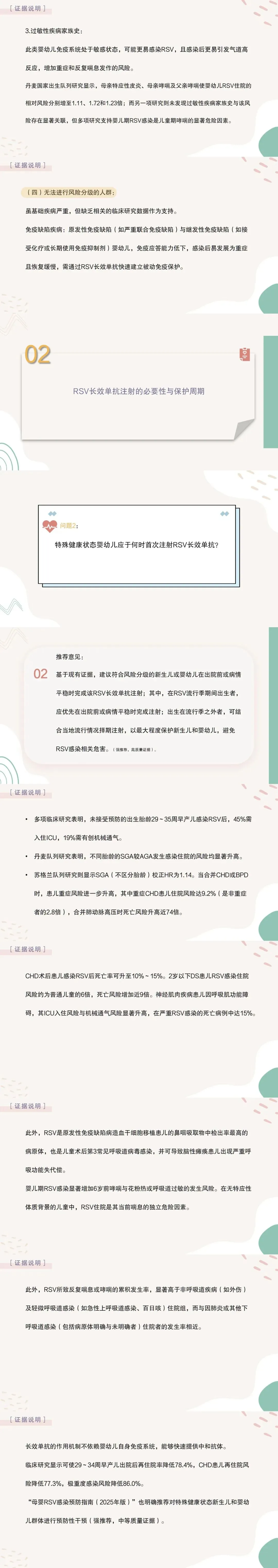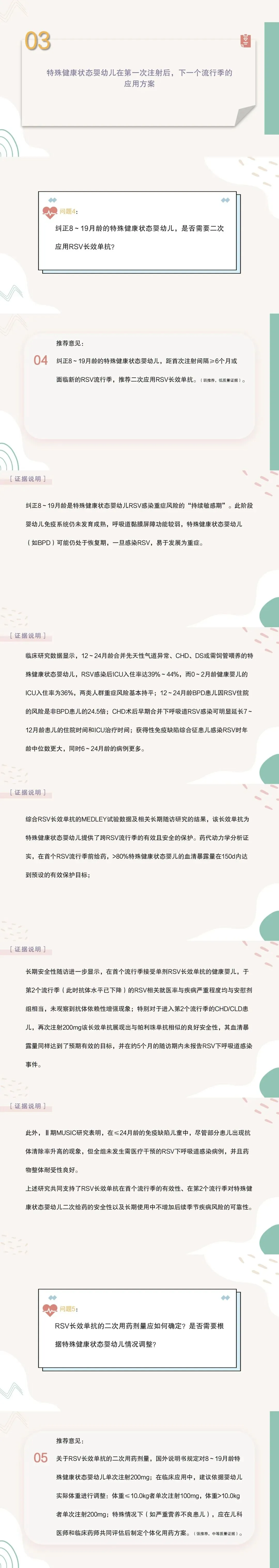 4.纠正8~19月龄的特殊健康状态婴幼儿,距首次注射间隔≥6个月或面临新的RSV流行季,推荐二次应用RSV长效单抗。