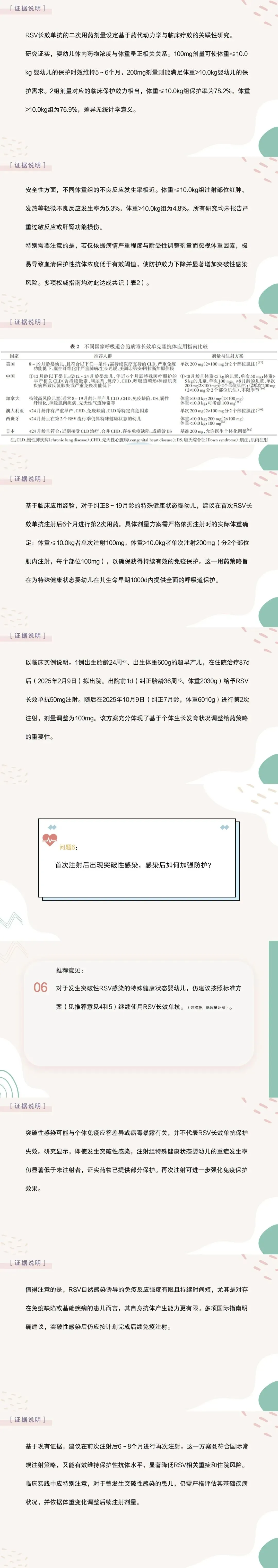 5.关于RSV长效单抗的二次用药剂量,国外说明书规定对8~19月龄特殊健康状态婴幼儿单次注射200mg;在临床应用中,建议依据婴幼儿实际体重进行调整:体重≤10.0kg者单次注射100mg,体重>10.0kg者单次注射200mg;特殊情况下(如严重营养不良患儿),应在儿科医师和临床药师共同评估后制定个体化用药方案。