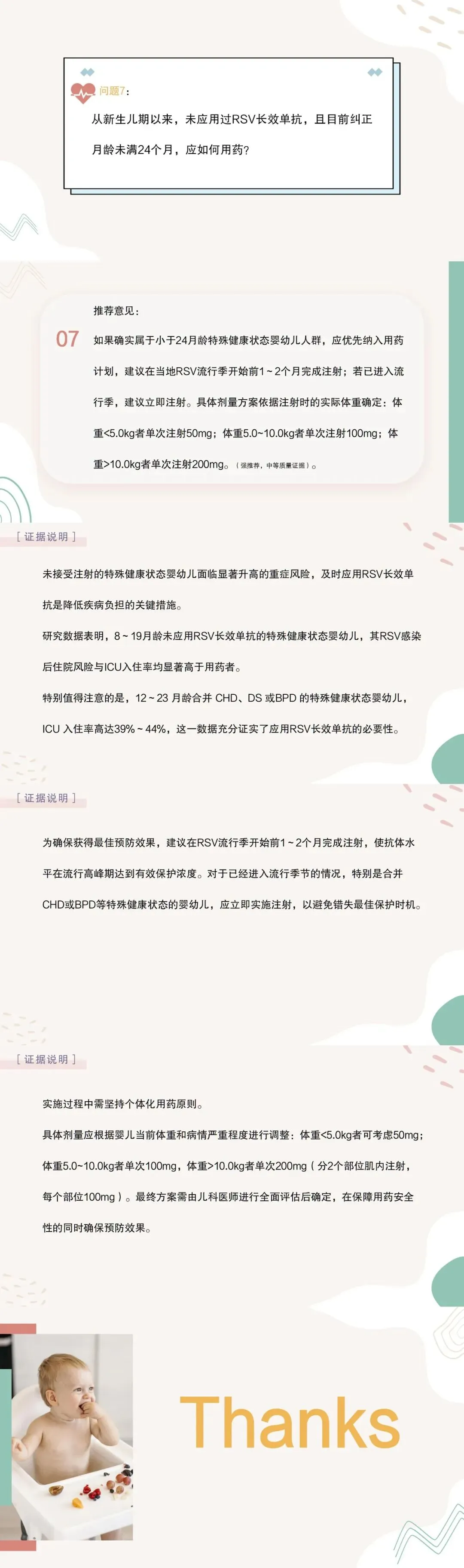6.对于发生突破性RSV感染的特殊健康状态婴幼儿,仍建议按照标准方案(见推荐意见4和5)继续使用RSV长效单抗。