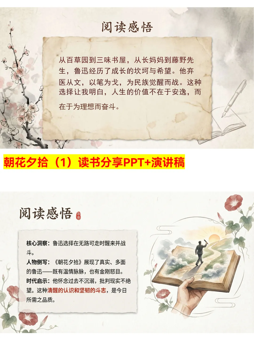 《朝花夕拾》作为教育部推荐读物,藏着太多值得深挖的内容!这份PPT详细梳理了作品概况,“朝花”喻早年经历,“夕拾”喻晚年追忆,寓意深刻。内容上覆盖《狗·猫·鼠》《五猖会》等经典篇目,既有童年生活的纯真乐趣,也有对社会现实的犀利批判。还介绍了长妈妈、藤野先生等经典人物,分析了叙事手法和语言风格,更有核心主题思想提炼。不管是课堂分享还是个人阅读,都能帮你快速掌握这本书的精髓~ #朝花夕拾 #读书分享 #PPT干货 #鲁迅作品 #名著解读 #阅读推荐 #文学常识 #学生读物 #散文赏析 #经典重温