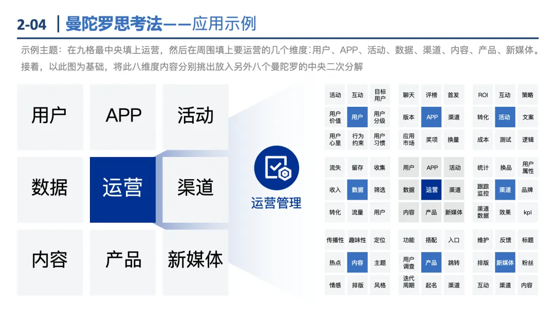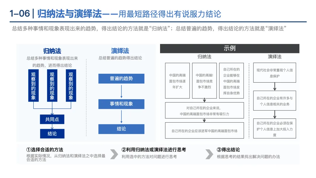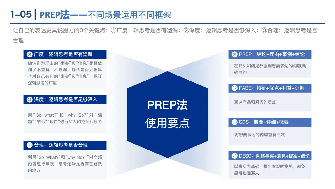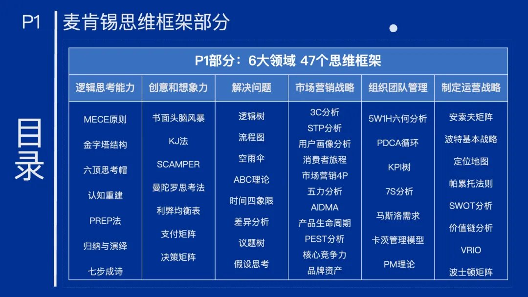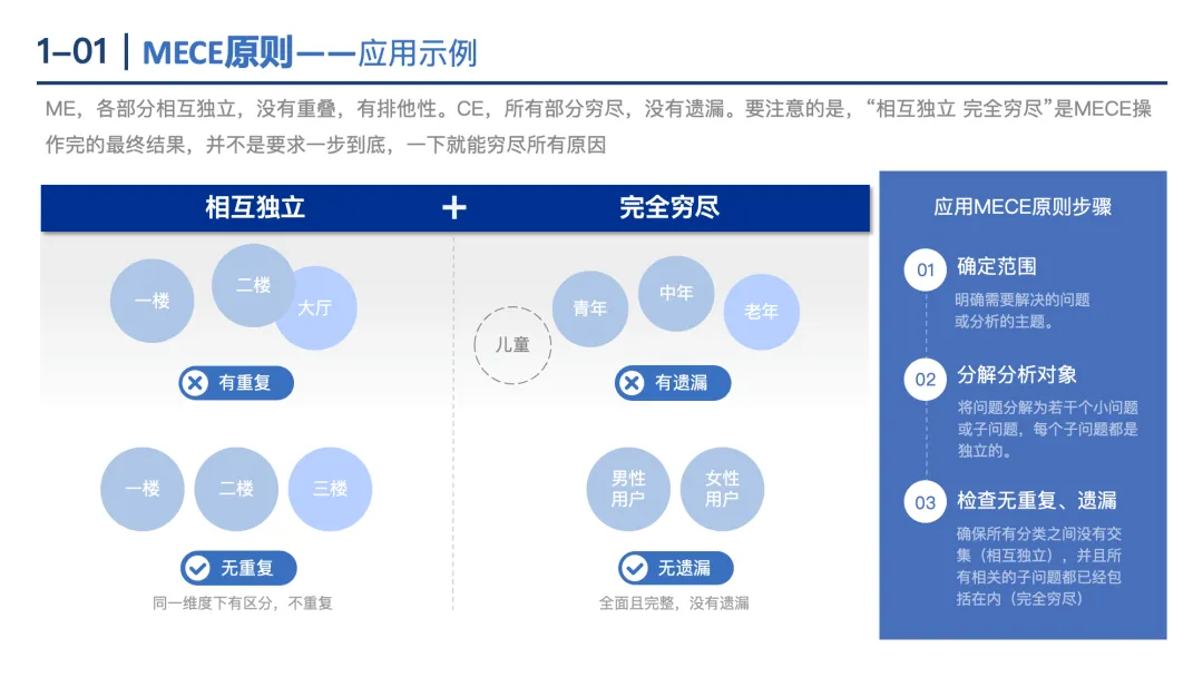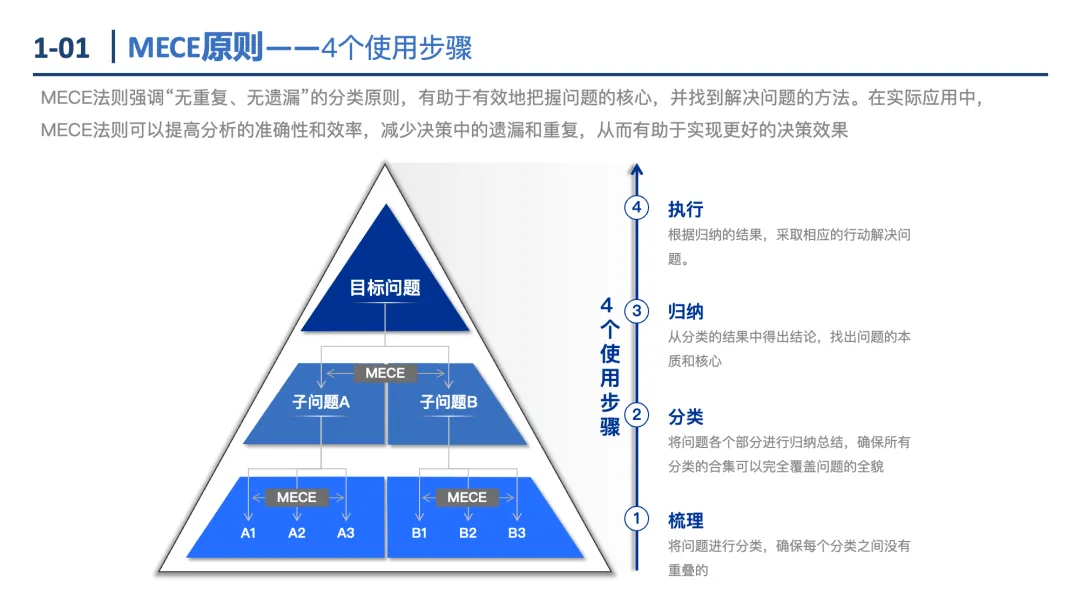 MECE原则:核心是“相互独立、完全穷尽”,通过二分法、流程法、公式法、要素法、矩阵法5种方式分解问题,确保分析全面无重叠。