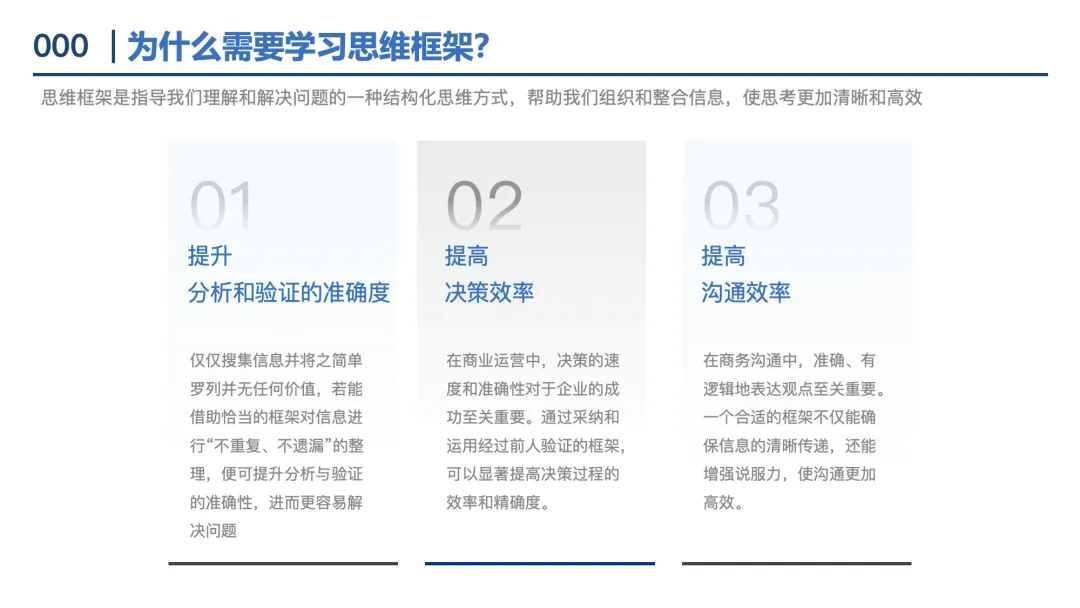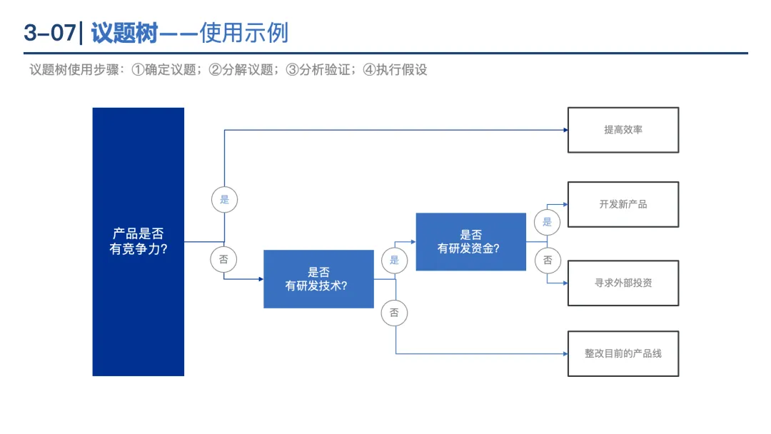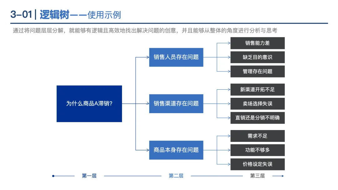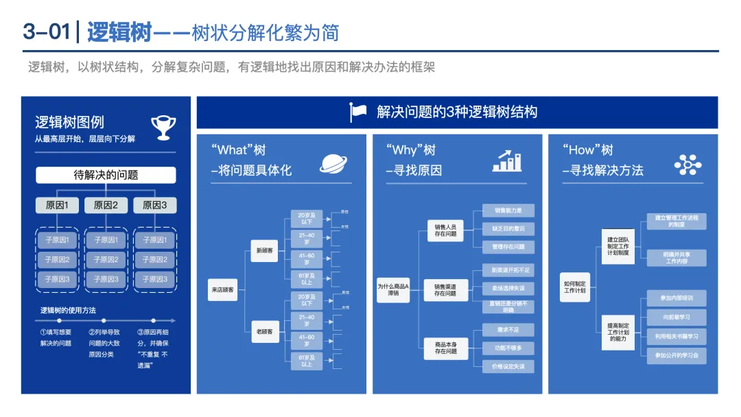 逻辑树:将问题拆解为“ What(具体化)、Why(找原因)、How(找方法)”三类子问题,确保分析有条理。