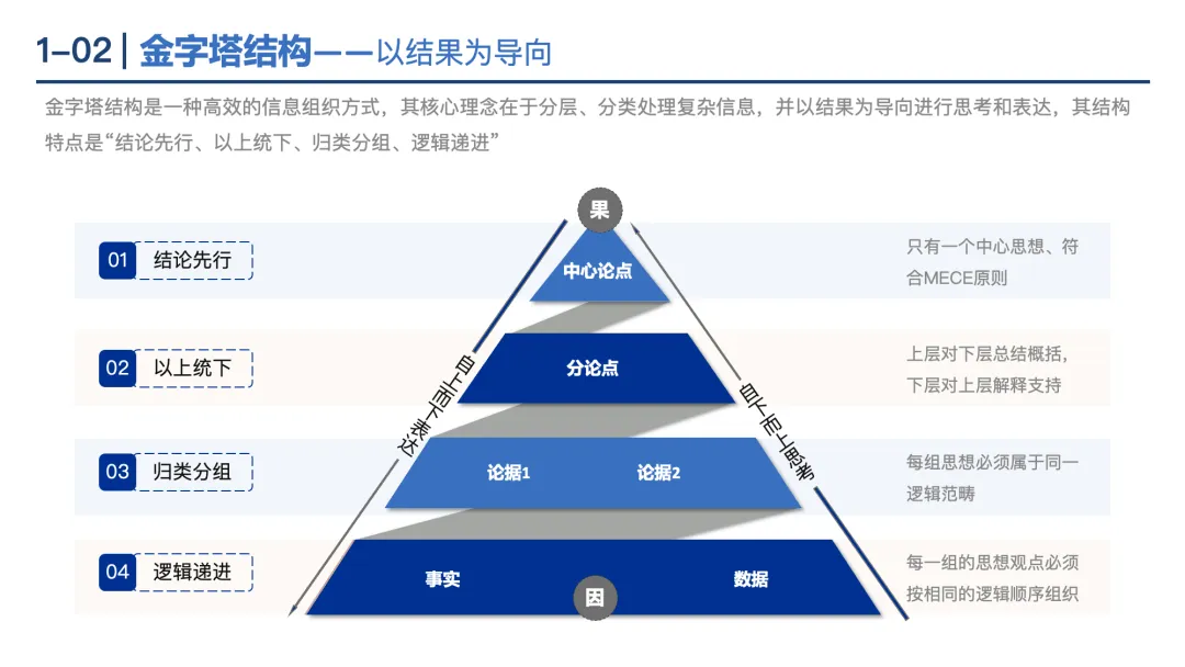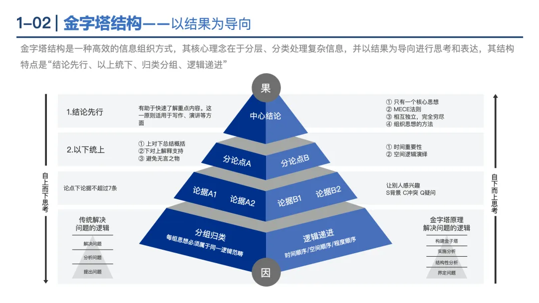 金字塔结构:特点为“结论先行、以上统下、归类分组、逻辑递进”,适用于高效组织信息和表达观点。