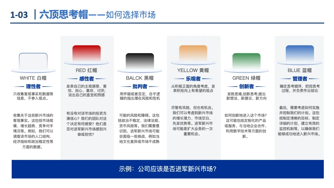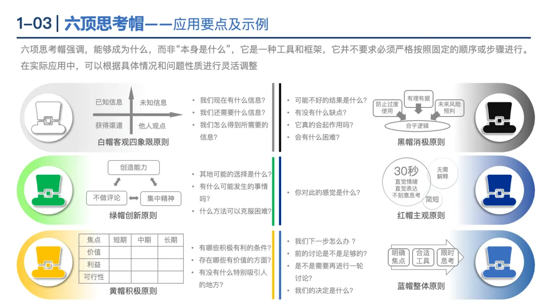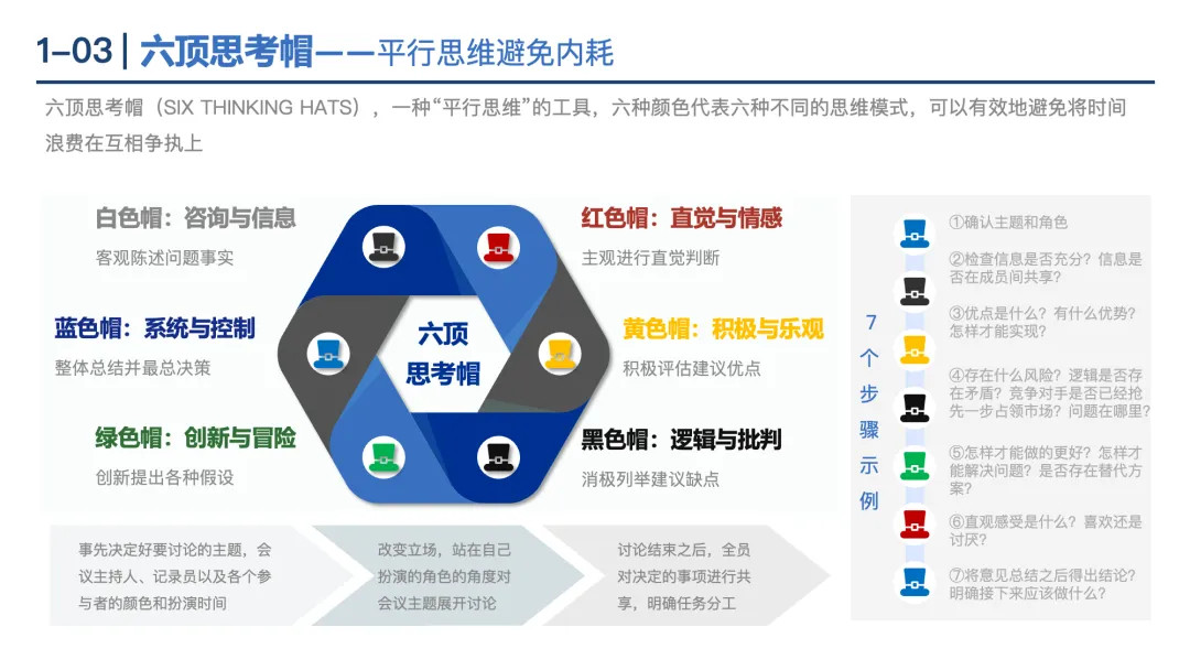 六顶思考帽:六种颜色代表不同思维模式(白帽:事实;红帽:情感;黄帽:积极;黑帽:批判;绿帽:创新;蓝帽:控制),避免讨论内耗。