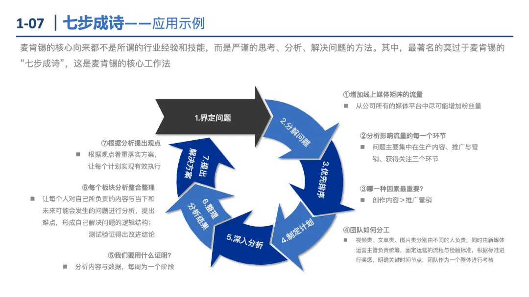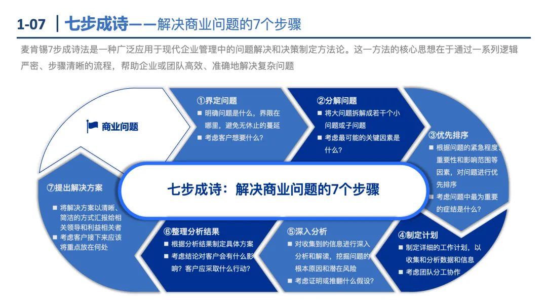 七步成诗:解决商业问题的7步骤——界定问题→分解问题→优先排序→制定计划→深入分析→整理结果→提出方案。