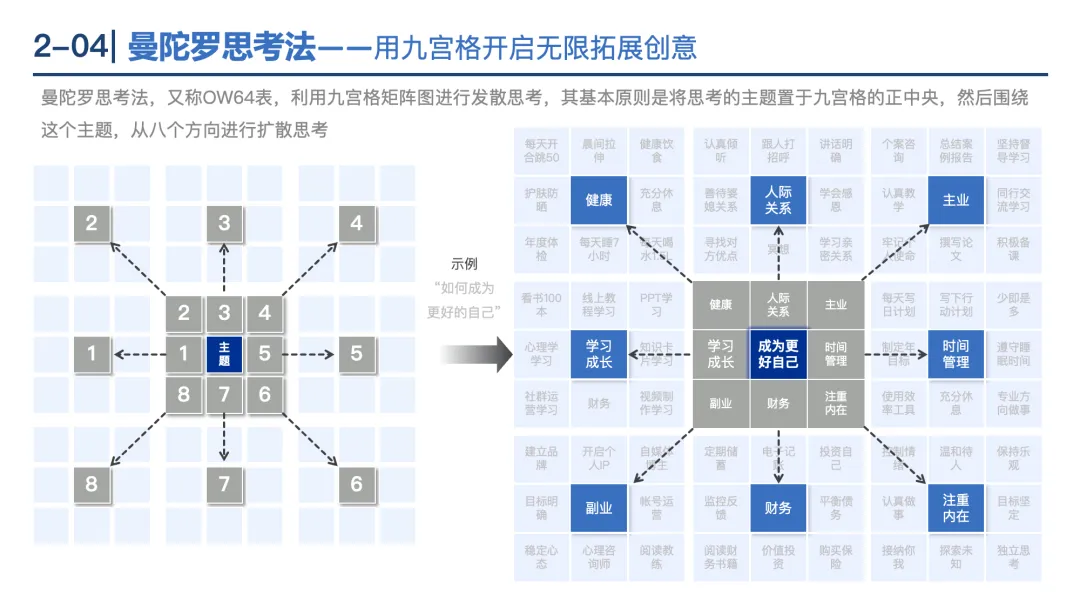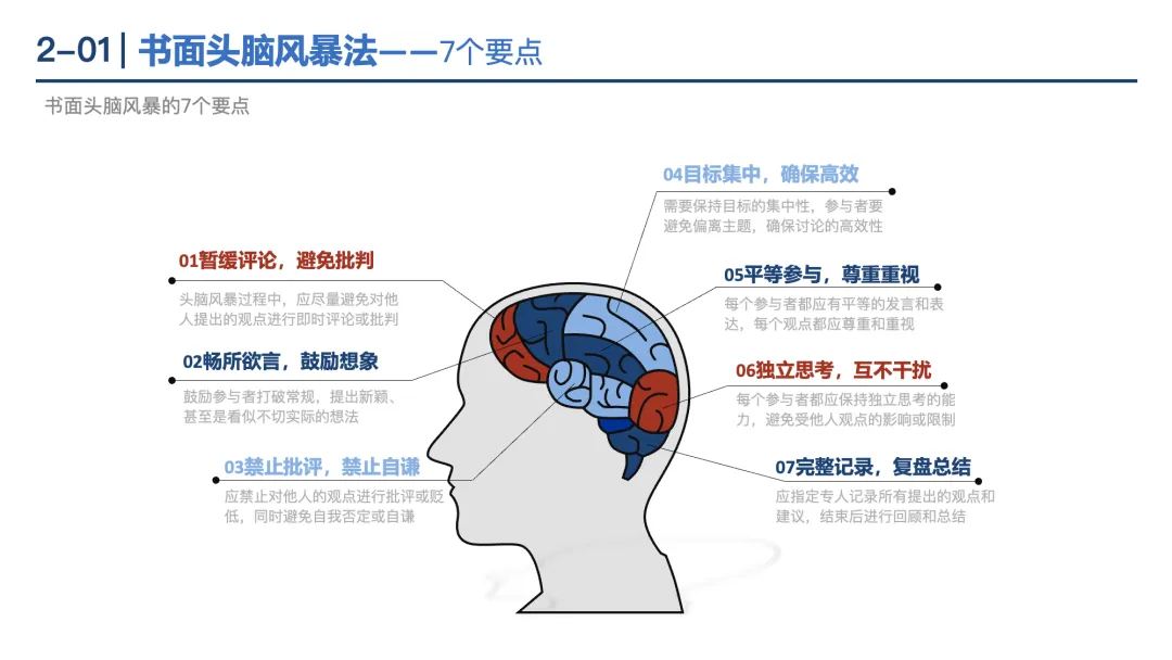 书面头脑风暴法:通过接力填写创意表格,遵循“暂缓评论、畅所欲言、平等参与”等7要点,短时间产出大量创意。