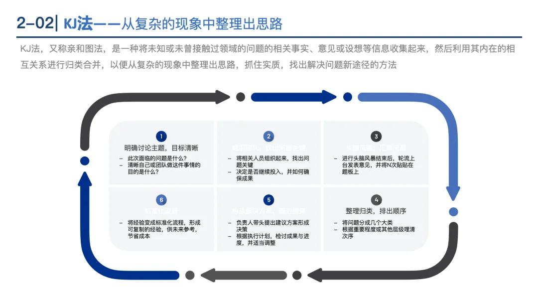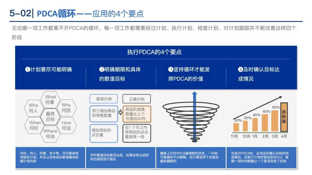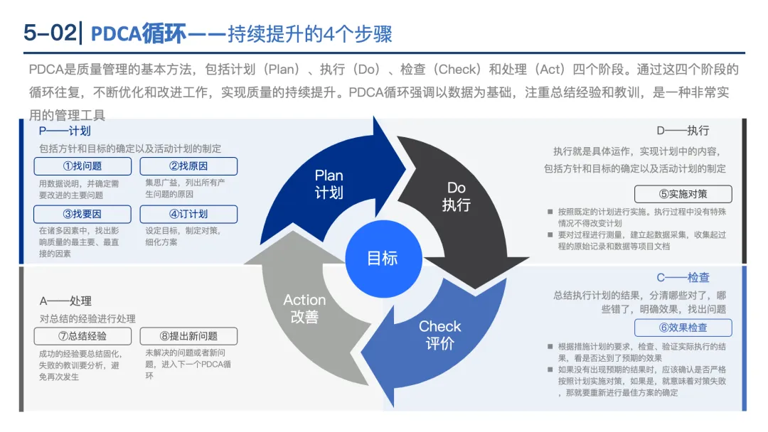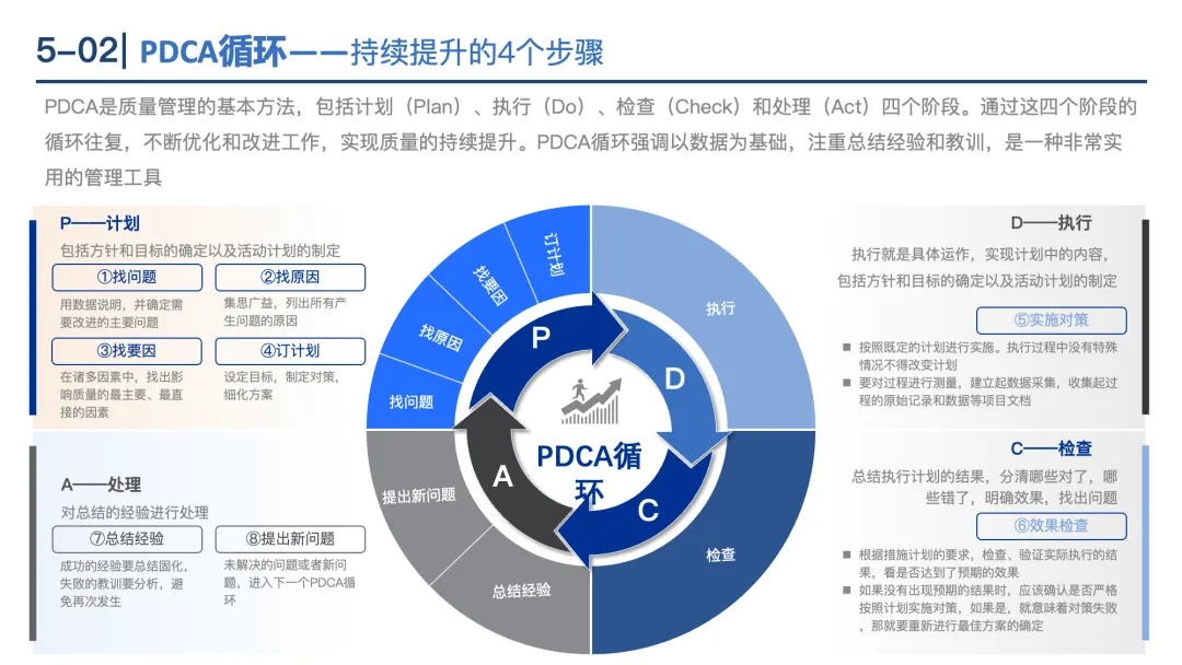 PDCA循环:通过“计划(Plan)→执行(Do)→检查(Check)→处理(Act)”的闭环,持续优化工作质量。