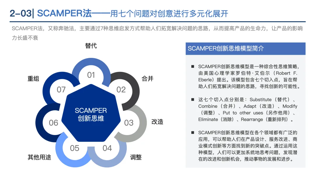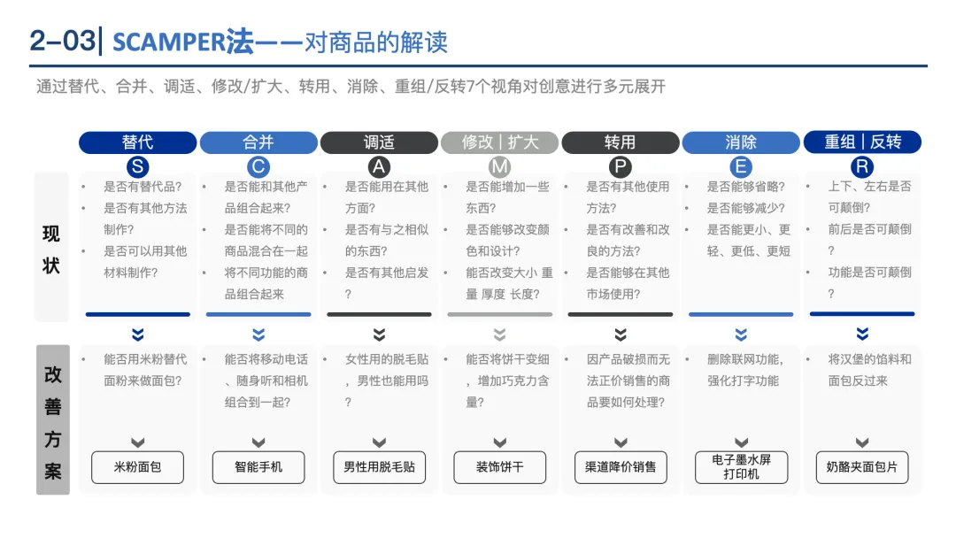 SCAMPER法:从替代(Substitute)、合并(Combine)、调适(Adapt)、修改/扩大(Modify)、转用(Put to other uses)、消除(Eliminate)、重组/反转(Rearrange)7维度拓展创意。